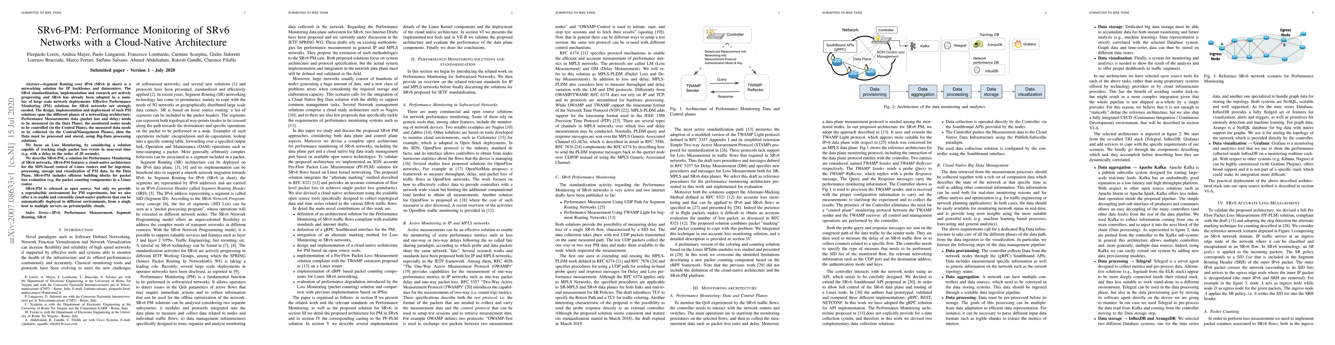 SRv6-PM is a cloud-native solution for Performance Monitoring of SRv6 networks, focusing on near-real-time packet loss tracking and leveraging SDN-based control of Linux routers. It provides an open-source, deployable platform for data collection, processing, storage, and visualization.