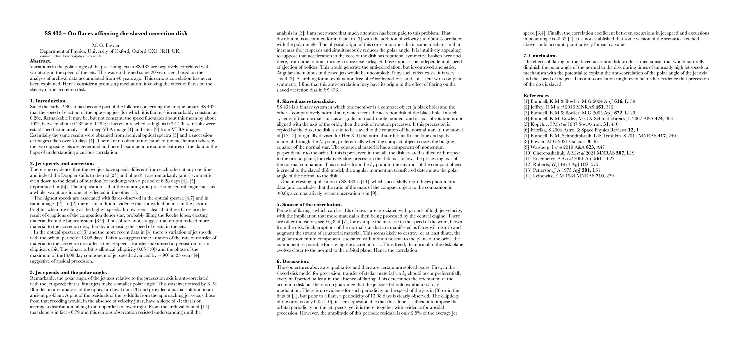 Variations in the polar angle of the precessing jets in SS 433 are negatively correlated with variations in the speed of the jets. This was established some 20 years ago, based on the analysis of archival data accumulated from 40 years ago. This curious correlation has never been explained. Here I consider a promising mechanism involving the effect of flares on the slavery of the accretion disk.