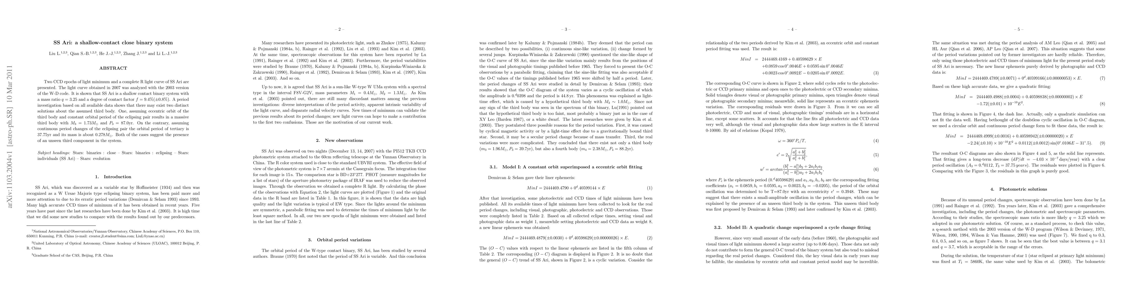 Two CCD epochs of light minimum and a complete R light curve of SS Ari are presented. The light curve obtained in 2007 was analyzed with the 2003 version of the W-D code. It is shown that SS Ari is a shallow contact binary system with a mass ratio $q=3.25$ and a degree of contact factor f=9.4(\pm0.8%). A period investigation based on all available data shows that there may exist two distinct solutions about the assumed third body. One, assuming eccentric orbit of the third body and constant orbital period of the eclipsing pair results in a massive third body with $M_3=1.73M_{\odot}$ and P_3=87.0$yr. On the contrary, assuming continuous period changes of the eclipsing pair the orbital period of tertiary is 37.75yr and its mass is about $0.278M_{\odot}$. Both of the cases suggest the presence of an unseen third component in the system.