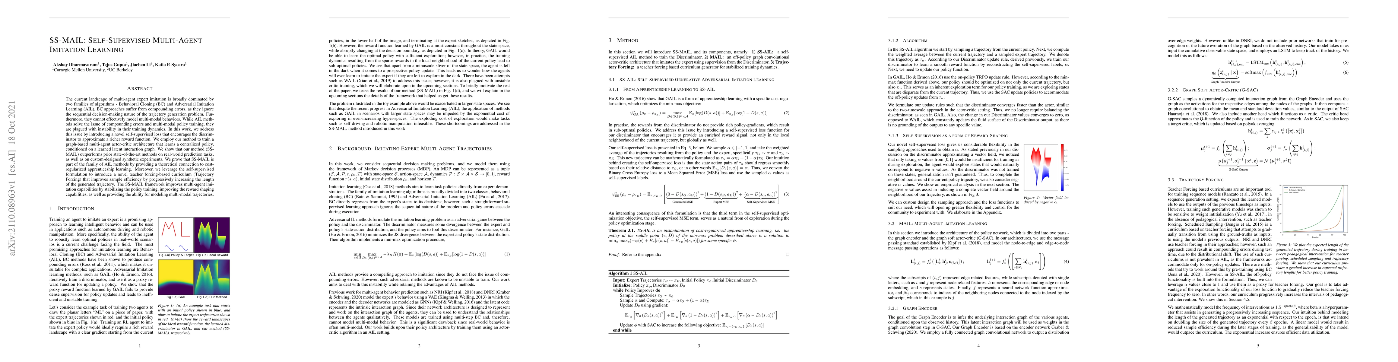 The current landscape of multi-agent expert imitation is broadly dominated by two families of algorithms - Behavioral Cloning (BC) and Adversarial Imitation Learning (AIL). BC approaches suffer from compounding errors, as they ignore the sequential decision-making nature of the trajectory generation problem. Furthermore, they cannot effectively model multi-modal behaviors. While AIL methods solve the issue of compounding errors and multi-modal policy training, they are plagued with instability in their training dynamics. In this work, we address this issue by introducing a novel self-supervised loss that encourages the discriminator to approximate a richer reward function. We employ our method to train a graph-based multi-agent actor-critic architecture that learns a centralized policy, conditioned on a learned latent interaction graph. We show that our method (SS-MAIL) outperforms prior state-of-the-art methods on real-world prediction tasks, as well as on custom-designed synthetic experiments. We prove that SS-MAIL is part of the family of AIL methods by providing a theoretical connection to cost-regularized apprenticeship learning. Moreover, we leverage the self-supervised formulation to introduce a novel teacher forcing-based curriculum (Trajectory Forcing) that improves sample efficiency by progressively increasing the length of the generated trajectory. The SS-MAIL framework improves multi-agent imitation capabilities by stabilizing the policy training, improving the reward shaping capabilities, as well as providing the ability for modeling multi-modal trajectories.