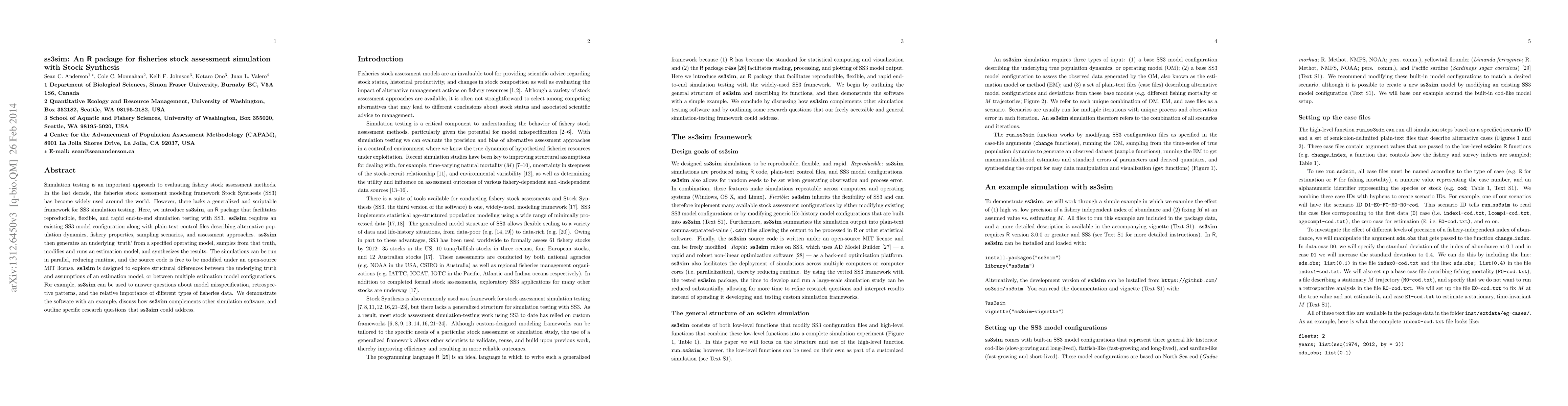 The ss3sim R package enables reproducible and flexible simulation testing for fisheries stock assessment using Stock Synthesis (SS3). It facilitates parallel simulation runs to explore model misspecification and the impact of different data types, under an open-source MIT license.
