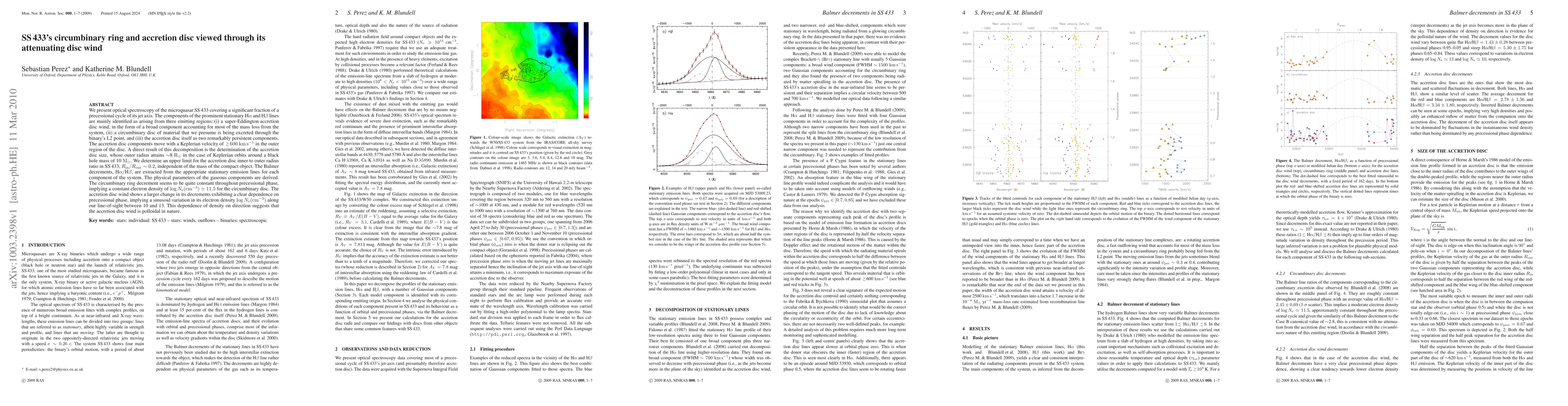 This study uses optical spectroscopy of microquasar SS433 across its precession cycle, identifying three emitting regions: a super-Eddington accretion disc wind, a circumbinary disc, and the accretion disc itself. The accretion disc's outer radius is determined to be ~8 solar radii, with an inner to outer radius ratio (~0.2) independent of the compact object's mass. Electron density variations in the circumbinary ring and accretion disc wind suggest a constant and sinusoidal density, respectively, indicating a polloidal accretion disc wind.