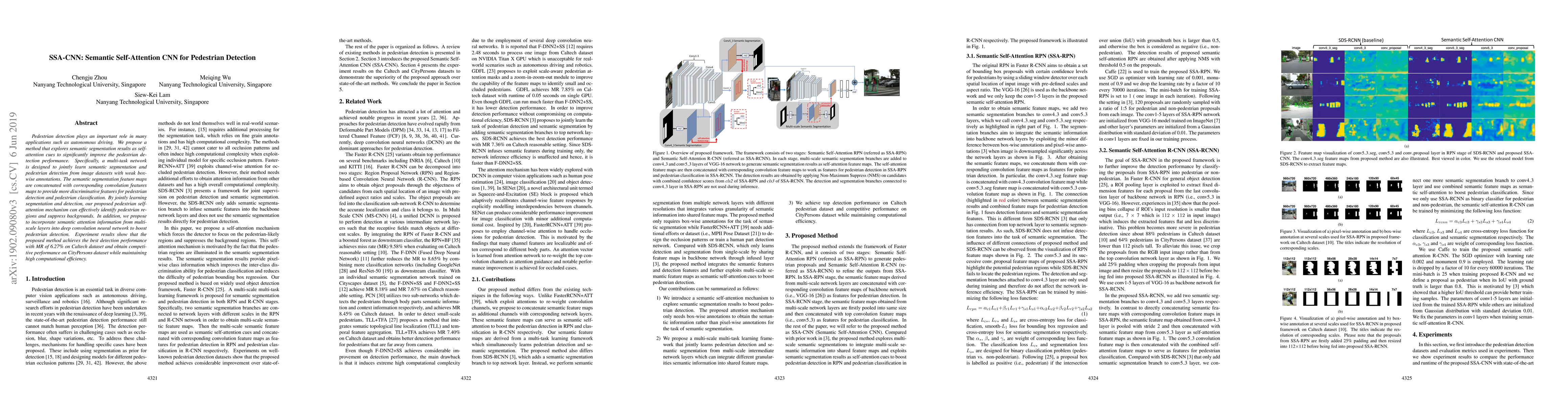 Pedestrian detection plays an important role in many applications such as autonomous driving. We propose a method that explores semantic segmentation results as self-attention cues to significantly improve the pedestrian detection performance. Specifically, a multi-task network is designed to jointly learn semantic segmentation and pedestrian detection from image datasets with weak box-wise annotations. The semantic segmentation feature maps are concatenated with corresponding convolution features maps to provide more discriminative features for pedestrian detection and pedestrian classification. By jointly learning segmentation and detection, our proposed pedestrian self-attention mechanism can effectively identify pedestrian regions and suppress backgrounds. In addition, we propose to incorporate semantic attention information from multi-scale layers into deep convolution neural network to boost pedestrian detection. Experiment results show that the proposed method achieves the best detection performance with MR of 6.27% on Caltech dataset and obtain competitive performance on CityPersons dataset while maintaining high computational efficiency.