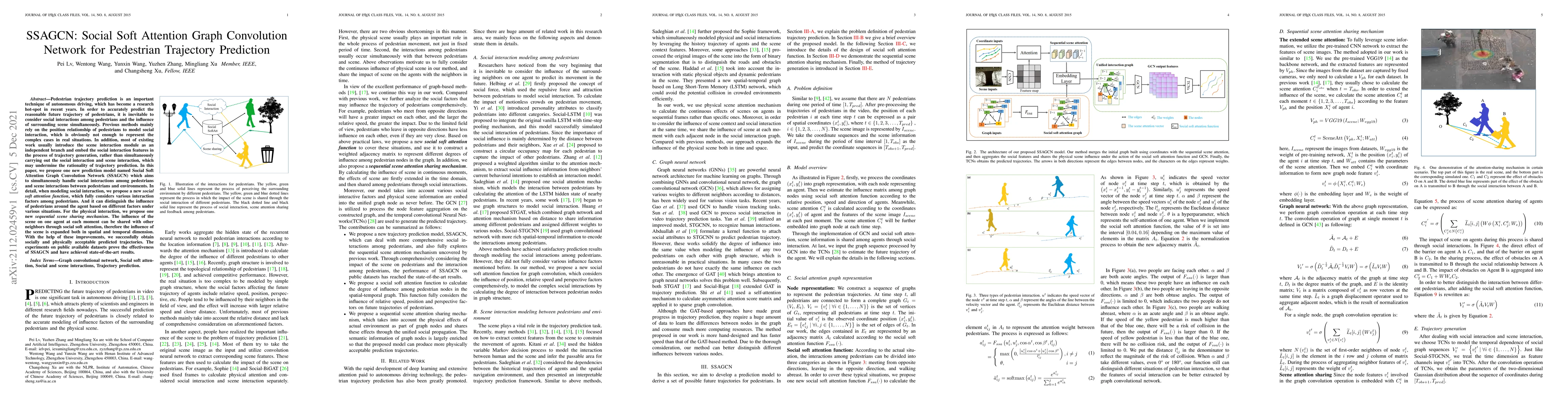 The paper proposes a Social Soft Attention Graph Convolution Network (SSAGCN) to improve pedestrian trajectory prediction by simultaneously modeling social interactions among pedestrians and scene interactions with the environment. SSAGCN introduces a social soft attention function and a sequential scene sharing mechanism to achieve more realistic and socially acceptable trajectory predictions, achieving state-of-the-art results on public datasets.