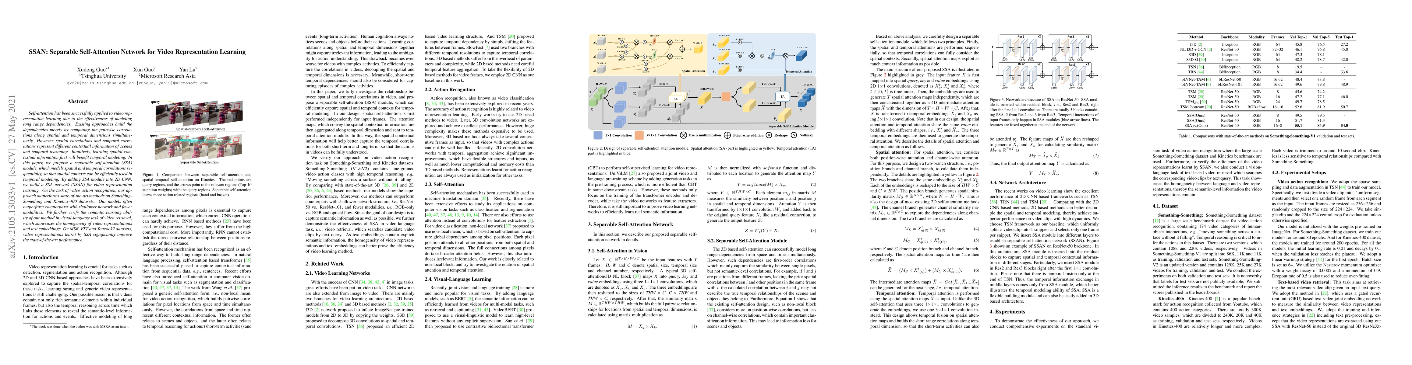 The paper proposes a Separable Self-Attention Network (SSAN) that sequentially models spatial and temporal correlations to improve video representation learning. The separable self-attention module outperforms existing methods on video action recognition and visual-language tasks, demonstrating enhanced semantic learning ability.