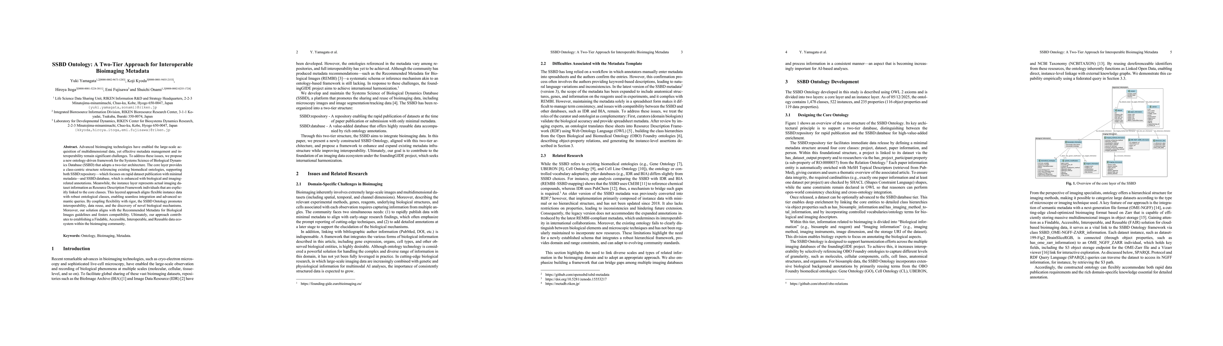 Advanced bioimaging technologies have enabled the large-scale acquisition of multidimensional data, yet effective metadata management and interoperability remain significant challenges. To address these issues, we propose a new ontology-driven framework for the Systems Science of Biological Dynamics Database (SSBD) that adopts a two-tier architecture. The core layer provides a class-centric structure referencing existing biomedical ontologies, supporting both SSBD:repository -- which focuses on rapid dataset publication with minimal metadata -- and SSBD:database, which is enhanced with biological and imaging-related annotations. Meanwhile, the instance layer represents actual imaging dataset information as Resource Description Framework individuals that are explicitly linked to the core classes. This layered approach aligns flexible instance data with robust ontological classes, enabling seamless integration and advanced semantic queries. By coupling flexibility with rigor, the SSBD Ontology promotes interoperability, data reuse, and the discovery of novel biological mechanisms. Moreover, our solution aligns with the Recommended Metadata for Biological Images guidelines and fosters compatibility. Ultimately, our approach contributes to establishing a Findable, Accessible, Interoperable, and Reusable data ecosystem within the bioimaging community.