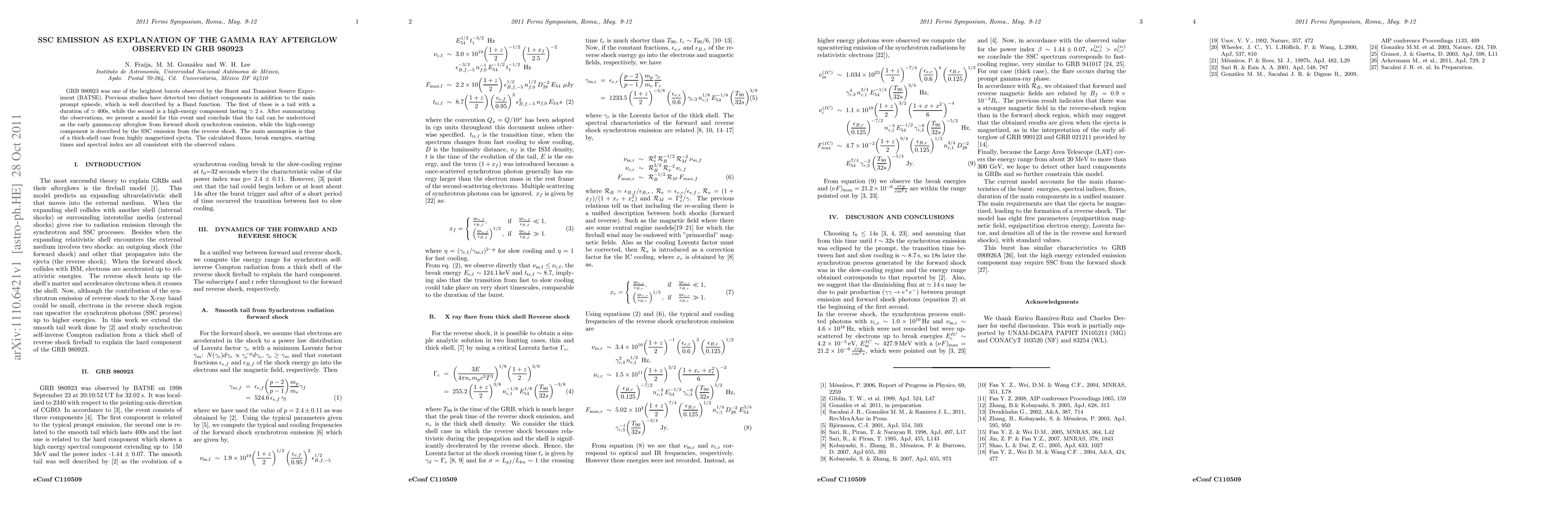 The paper introduces a model that successfully explains the gamma-ray afterglow of GRB 980923 using synchrotron and SSC emissions from forward and reverse shocks, respectively, under the assumption of a thick shell from highly magnetized ejecta.