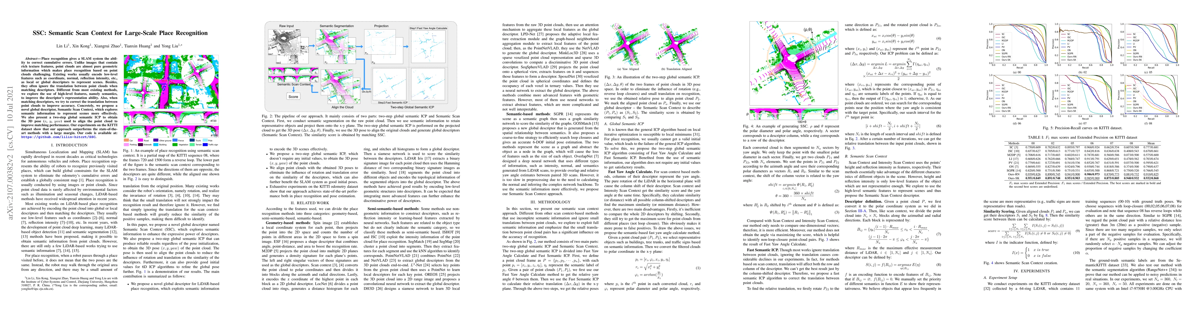 This paper proposes a Semantic Scan Context (SSC) for large-scale place recognition using point clouds, leveraging high-level semantic information to enhance descriptor representation. It introduces a two-step global semantic ICP for 3D pose estimation to correct translation, achieving superior performance on the KITTI dataset compared to existing methods.
