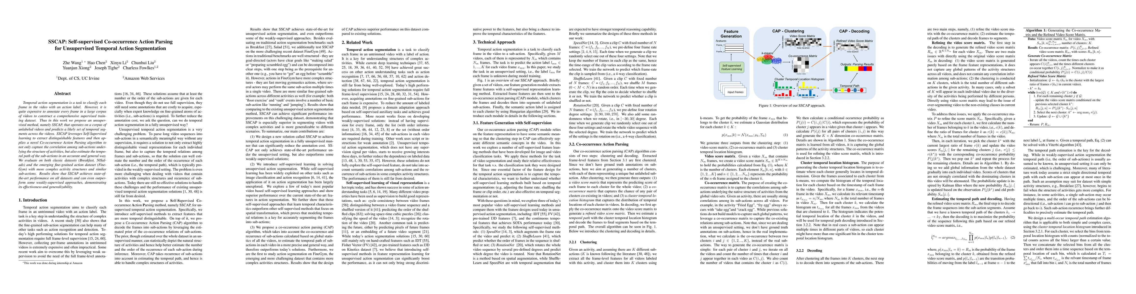 SSCAP is an unsupervised method for temporal action segmentation that leverages self-supervised learning to extract features and uses a Co-occurrence Action Parsing algorithm to identify temporal segments in unlabeled videos, achieving state-of-the-art performance on classic and fine-grained action datasets.