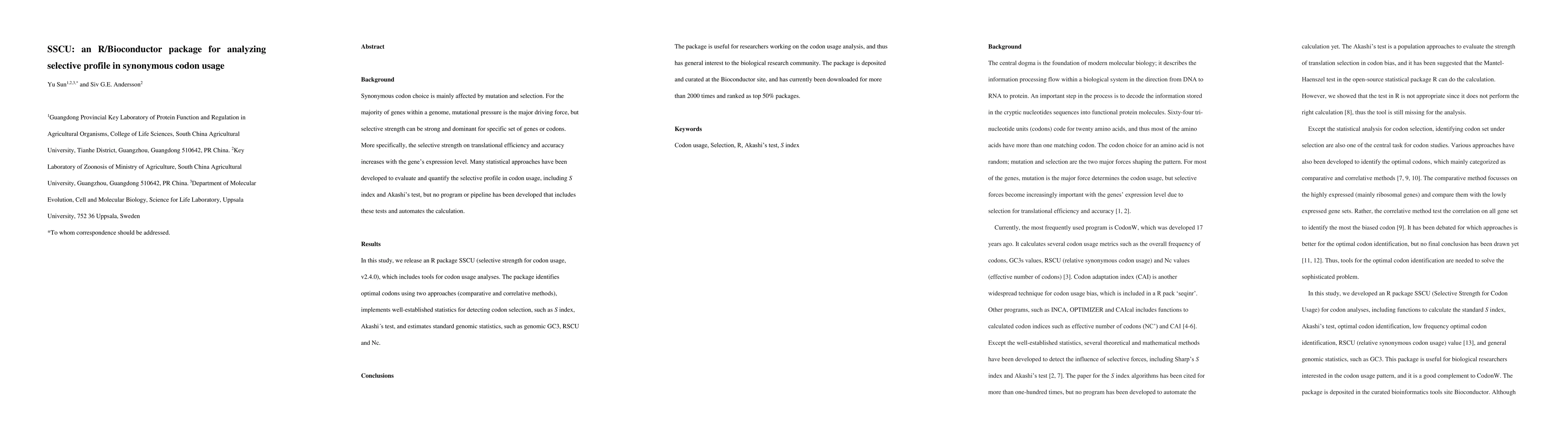 The SSCU R/Bioconductor package automates the analysis of selective profiles in synonymous codon usage, incorporating methods like S index and Akashi's test to evaluate translational efficiency and accuracy. It has been downloaded over 2000 times and ranks in the top 50% of Bioconductor packages.