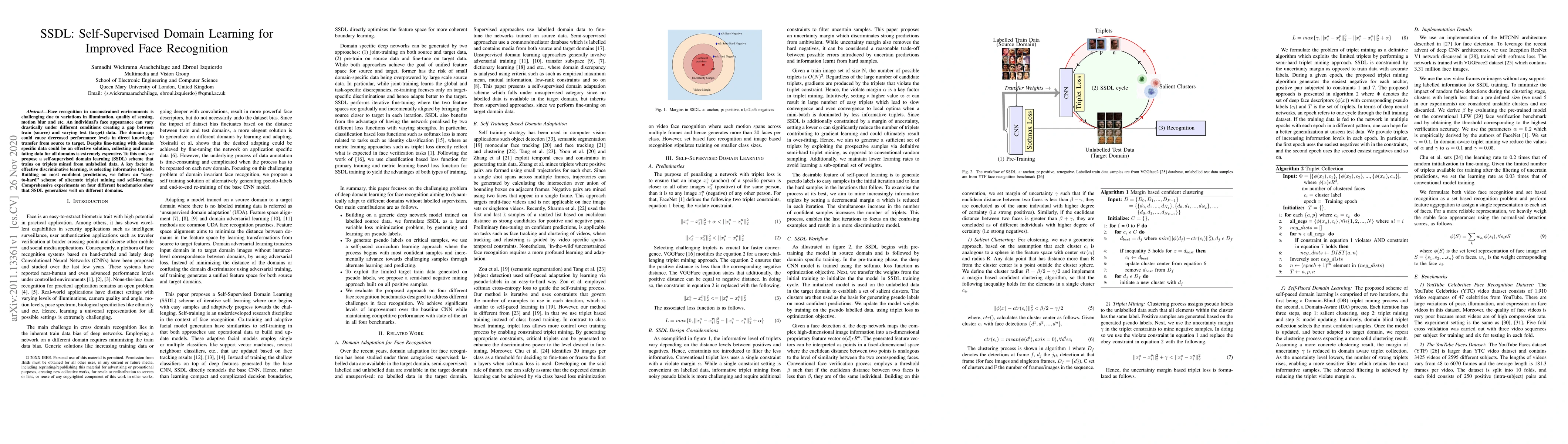 The paper proposes a self-supervised domain learning (SSDL) scheme to improve face recognition in unconstrained environments by training on triplets mined from unlabeled data, addressing the domain gap without the need for domain-specific annotated data. Experiments demonstrate that SSDL effectively generalizes across different benchmarks.