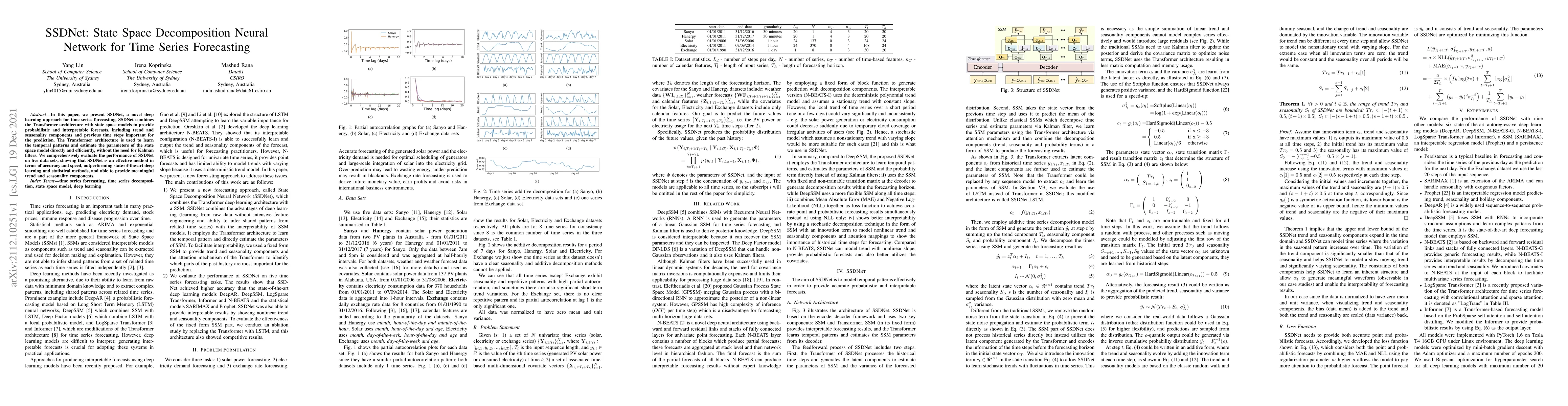 SSDNet is a deep learning method combining Transformer architecture with state space models for time series forecasting, offering probabilistic and interpretable forecasts. It outperforms existing methods in accuracy and speed, and provides meaningful trend and seasonality components.