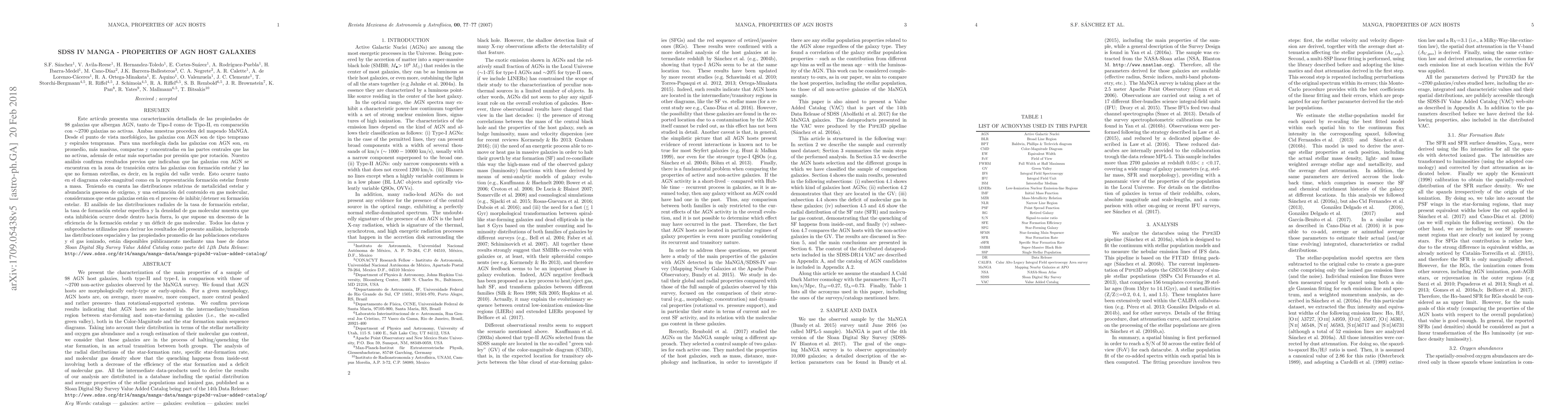 We present here the characterization of the main properties of a sample of 98 AGN host galaxies, both type-II and type-I, in comparison with those of about 2700 non-active galaxies observed by the MaNGA survey. We found that AGN hosts are morphologically early-type or early-spirals. For a given morphology AGN hosts are, in average, more massive, more compact, more central peaked and rather pressurethan rotational-supported systems. We confirm previous results indicating that AGN hosts are located in the intermediate/transition region between star-forming and non-star-forming galaxies (i.e., the so-called green valley), both in the ColorMagnitude and the star formation main sequence diagrams. Taking into account their relative distribution in terms of the stellar metallicity and oxygen gas abundance and a rough estimation of their molecular gas content, we consider that these galaxies are in the process of halting/quenching the star formation, in an actual transition between both groups. The analysis of the radial distributions of the starformation rate, specific star-formation rate, and molecular gas density shows that the quenching happens from inside-out involving both a decrease of the efficiency of the star formation and a deficit of molecular gas. All the intermediate data-products used to derive the results of our analysis are distributed in a database including the spatial distribution and average properties of the stellar populations and ionized gas, published as a Sloan Digital Sky Survey Value Added Catalog being part of the 14th Data Release: http://www.sdss.org/dr14/manga/manga-data/manga-pipe3d-value-added-catalog/