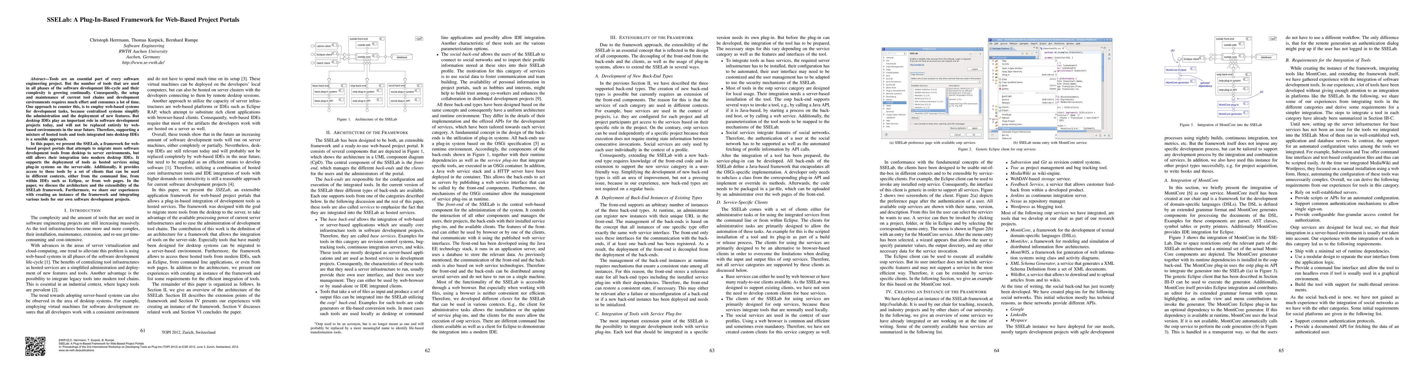 SSELab is a framework for web-based project portals that aims to migrate software development tools from desktop to server environments while allowing integration with desktop IDEs. It supports tool deployment as hosted services and provides access via various clients, including IDEs and web pages.