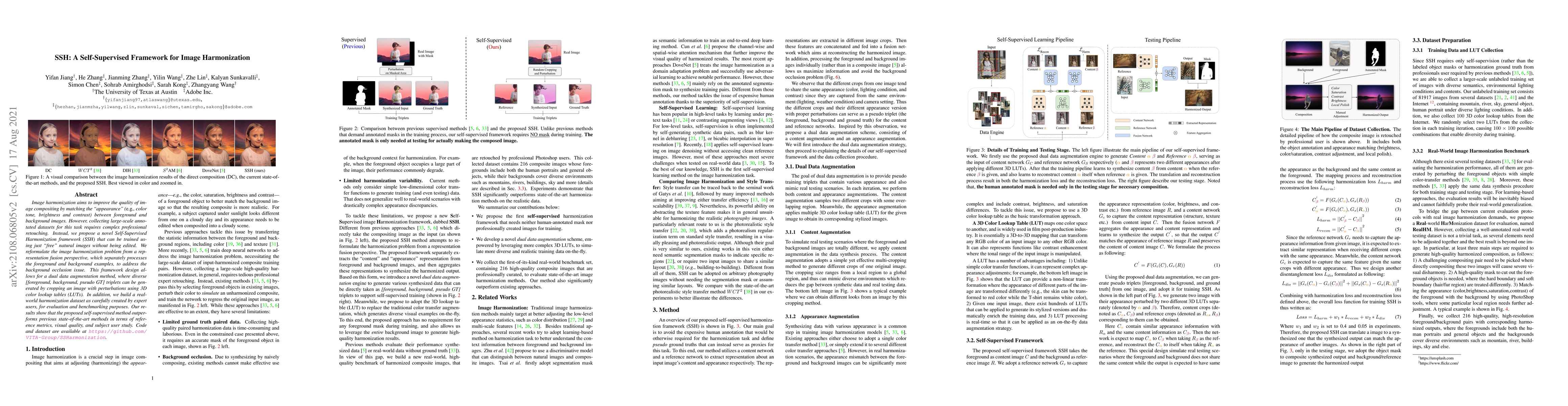The SSH framework proposes a self-supervised method for image harmonization that trains without requiring annotated datasets, using natural images and a representation fusion approach to address background occlusion. The method outperforms previous techniques in both metrics and user studies, with code and a benchmark dataset available for further research.