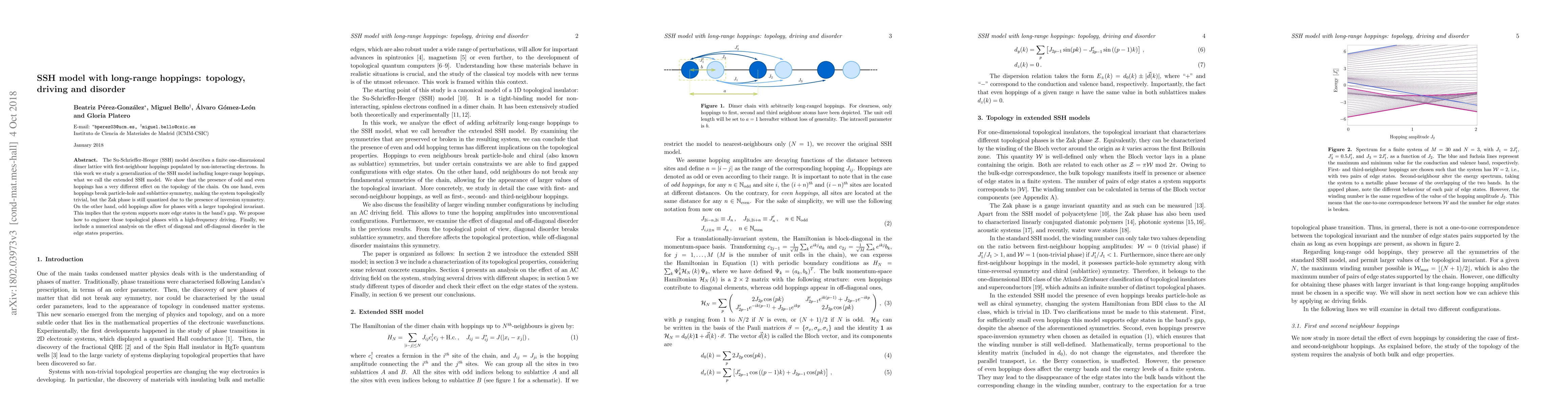 The Su-Schrieffer-Heeger (SSH) model describes a finite one-dimensional dimer lattice with first-neighbour hoppings populated by non-interacting electrons. In this work we study a generalization of the SSH model including longer-range hoppings, what we call the extended SSH model. We show that the presence of odd and even hoppings has a very different effect on the topology of the chain. On one hand, even hoppings break particle-hole and sublattice symmetry, making the system topologically trivial, but the Zak phase is still quantized due to the presence of inversion symmetry. On the other hand, odd hoppings allow for phases with a larger topological invariant. This implies that the system supports more edge states in the band's gap. We propose how to engineer those topological phases with a high-frequency driving. Finally, we include a numerical analysis on the effect of diagonal and off-diagonal disorder in the edge states properties.