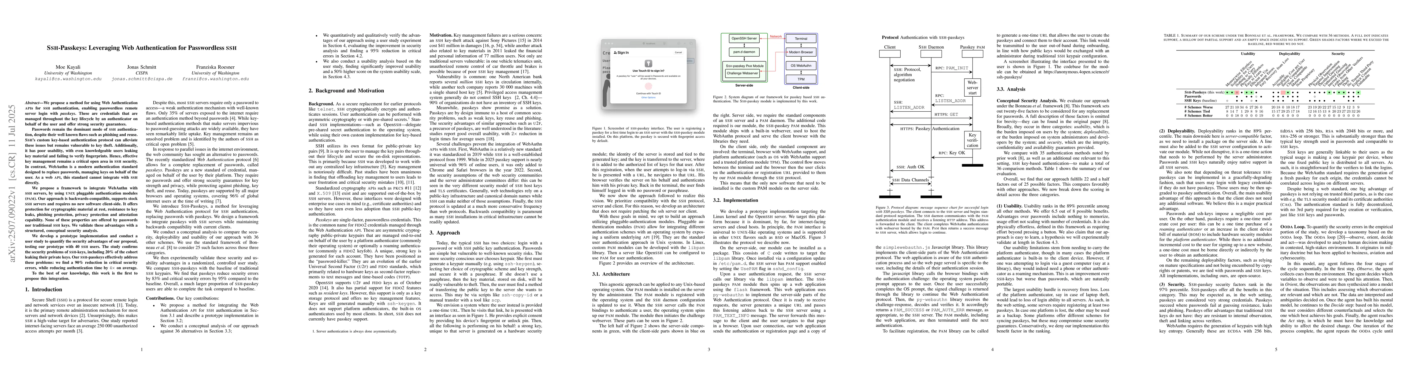 We propose a method for using Web Authentication APIs for SSH authentication, enabling passwordless remote server login with passkeys. These are credentials that are managed throughout the key lifecycle by an authenticator on behalf of the user and offer strong security guarantees. Passwords remain the dominant mode of SSH authentication, despite their well known flaws such as phishing and reuse. SSH's custom key-based authentication protocol can alleviate these issues but remains vulnerable to key theft. Additionally, it has poor usability, with even knowledgeable users leaking key material and failing to verify fingerprints. Hence, effective key management remains a critical open area in SSH security. In contrast, WebAuthn is a modern authentication standard designed to replace passwords, managing keys on behalf of the user. As a web API, this standard cannot integrate with SSH directly. We propose a framework to integrate WebAuthn with SSH servers, by using UNIX pluggable authentication modules (PAM). Our approach is backwards-compatible, supports stock SSH servers and requires no new software client-side. It offers protection for cryptographic material at rest, resistance to key leaks, phishing protection, privacy protection and attestation capability. None of these properties are offered by passwords nor traditional SSH keys. We validate these advantages with a structured, conceptual security analysis. We develop a prototype implementation and conduct a user study to quantify the security advantages of our proposal, testing our prototype with 40 SSH users. The study confirms the security problems of SSH-keys, including 20% of the cohort leaking their private keys. Our SSH-passkeys effectively address these problems: we find a 90% reduction in critical security errors, while reducing authentication time by 4x on average.