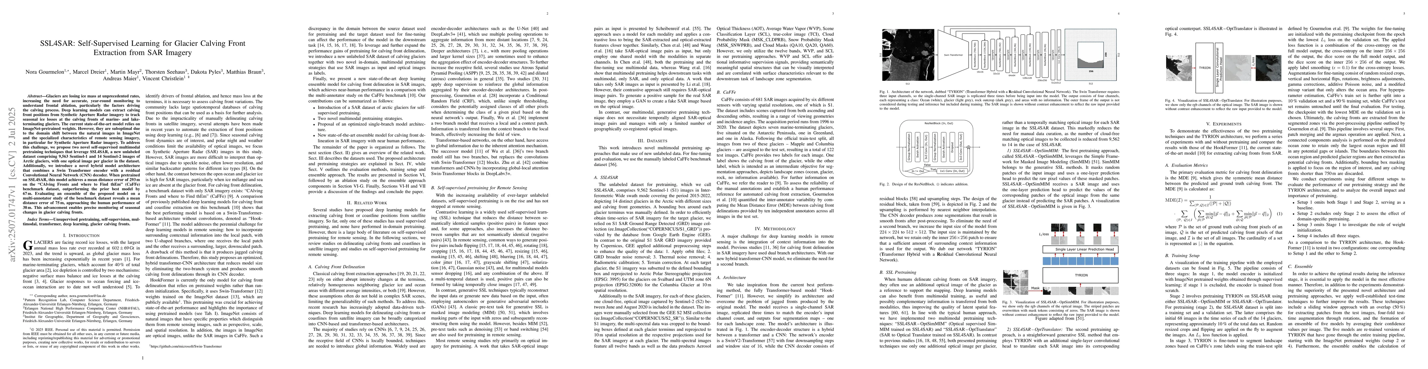 Glaciers are losing ice mass at unprecedented rates, increasing the need for accurate, year-round monitoring to understand frontal ablation, particularly the factors driving the calving process. Deep learning models can extract calving front positions from Synthetic Aperture Radar imagery to track seasonal ice losses at the calving fronts of marine- and lake-terminating glaciers. The current state-of-the-art model relies on ImageNet-pretrained weights. However, they are suboptimal due to the domain shift between the natural images in ImageNet and the specialized characteristics of remote sensing imagery, in particular for Synthetic Aperture Radar imagery. To address this challenge, we propose two novel self-supervised multimodal pretraining techniques that leverage SSL4SAR, a new unlabeled dataset comprising 9,563 Sentinel-1 and 14 Sentinel-2 images of Arctic glaciers, with one optical image per glacier in the dataset. Additionally, we introduce a novel hybrid model architecture that combines a Swin Transformer encoder with a residual Convolutional Neural Network (CNN) decoder. When pretrained on SSL4SAR, this model achieves a mean distance error of 293 m on the "CAlving Fronts and where to Find thEm" (CaFFe) benchmark dataset, outperforming the prior best model by 67 m. Evaluating an ensemble of the proposed model on a multi-annotator study of the benchmark dataset reveals a mean distance error of 75 m, approaching the human performance of 38 m. This advancement enables precise monitoring of seasonal changes in glacier calving fronts.