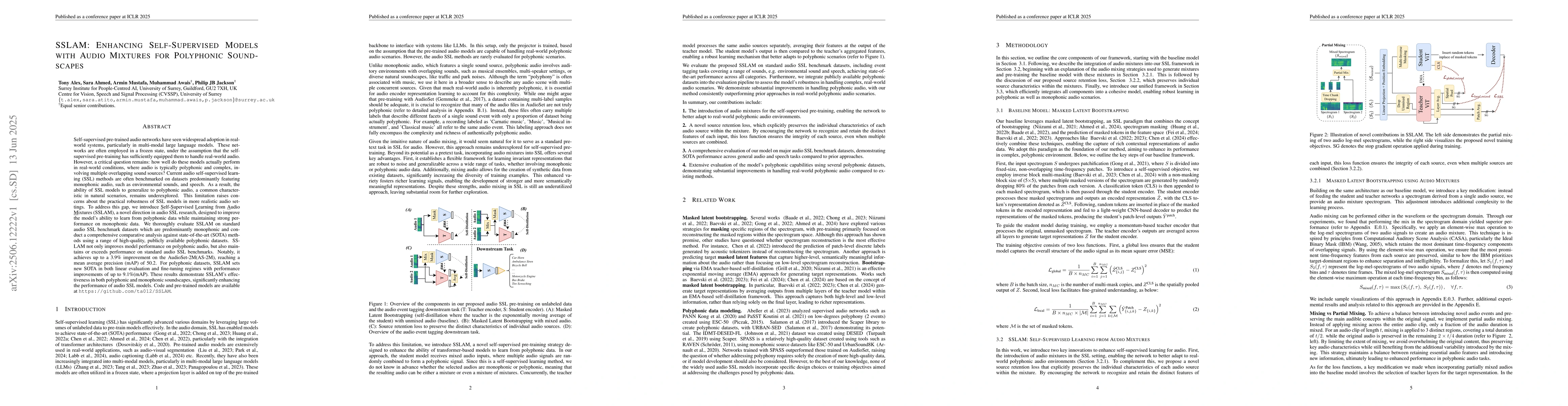 The paper introduces SSLAM, a new approach for self-supervised audio learning, addressing the limitation of current methods that perform poorly on polyphonic, complex real-world audio. SSLAM enhances model performance on polyphonic data while maintaining monophonic performance, demonstrating up to a 9.1% improvement on polyphonic datasets and a 3.9% improvement on the AudioSet-2M benchmark.