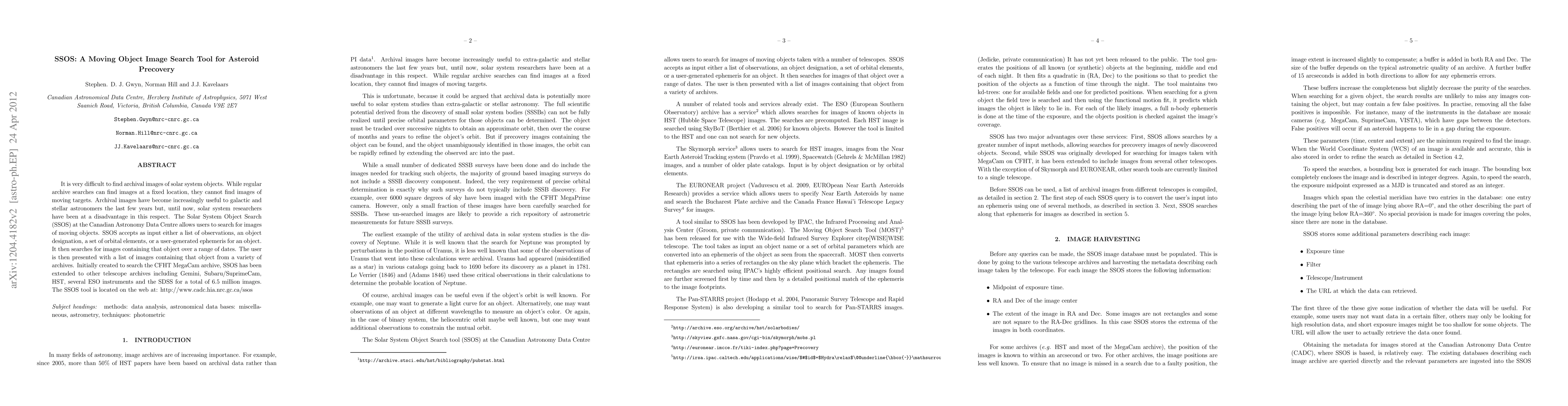 It is very difficult to find archival images of solar system objects. While regular archive searches can find images at a fixed location, they cannot find images of moving targets. Archival images have become increasingly useful to galactic and stellar astronomers the last few years but, until now, solar system researchers have been at a disadvantage in this respect. The Solar System Object Search (SSOS) at the Canadian Astronomy Data Centre allows users to search for images of moving objects. SSOS accepts as input either a list of observations, an object designation, a set of orbital elements, or a user-generated ephemeris for an object. It then searches for images containing that object over a range of dates. The user is then presented with a list of images containing that object from a variety of archives. Initially created to search the CFHT MegaCam archive, SSOS has been extended to other telescope archives including Gemini, Subaru/SuprimeCam, HST, several ESO instruments and the SDSS for a total of 6.5 million images. The SSOS tool is located on the web at: http://www.cadc.hia.nrc.gc.ca/ssos