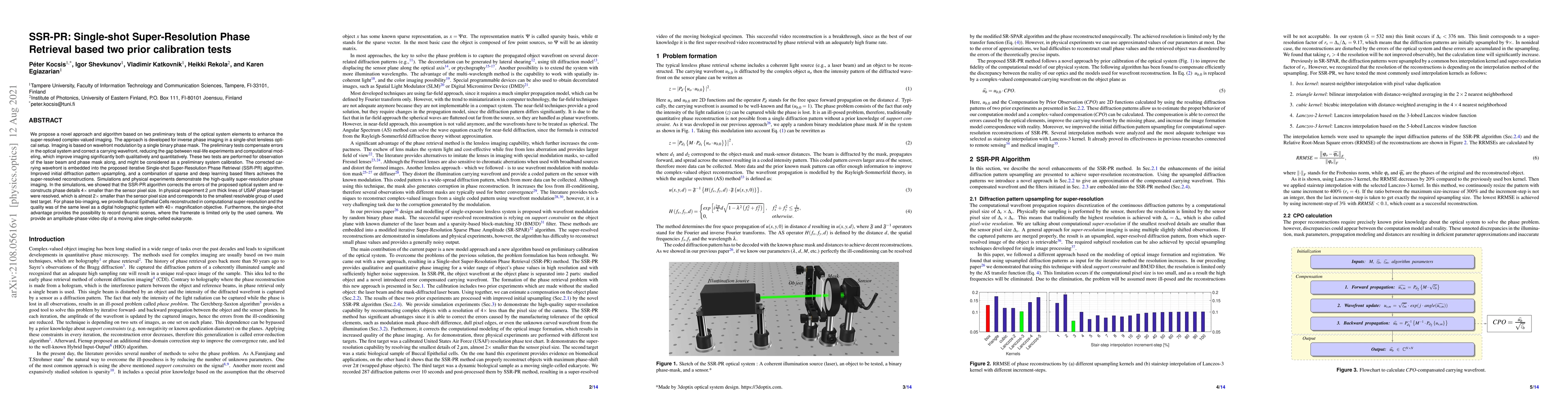 We propose a novel approach and algorithm based on two preliminary tests of the optical system elements to enhance the super-resolved complex-valued imaging. The approach is developed for inverse phase imaging in a single-shot lensless optical setup. Imaging is based on wavefront modulation by a single binary phase mask. The preliminary tests compensate errors in the optical system and correct a carrying wavefront, reducing the gap between real-life experiments and computational modeling, which improve imaging significantly both qualitatively and quantitatively. These two tests are performed for observation of the laser beam and phase mask along, and might be considered as a preliminary system calibration. The corrected carrying wavefront is embedded into the proposed iterative Single-shot Super-Resolution Phase Retrieval (SSR-PR) algorithm. Improved initial diffraction pattern upsampling, and a combination of sparse and deep learning based filters achieves the super-resolved reconstructions. Simulations and physical experiments demonstrate the high-quality super-resolution phase imaging. In the simulations, we showed that the SSR-PR algorithm corrects the errors of the proposed optical system and reconstructs phase details 4x smaller than the sensor pixel size. In physical experiment 2um thick lines of USAF phase-target were resolved, which is almost 2x smaller than the sensor pixel size and corresponds to the smallest resolvable group of used test target. For phase bio-imaging, we provide Buccal Epithelial Cells reconstructed in computational super-resolution and the quality was of the same level as a digital holographic system with 40x magnification objective. Furthermore, the single-shot advantage provides the possibility to record dynamic scenes, where the framerate is limited only by the used camera. We provide amplitude-phase video clip of a moving alive single-celled eukaryote.