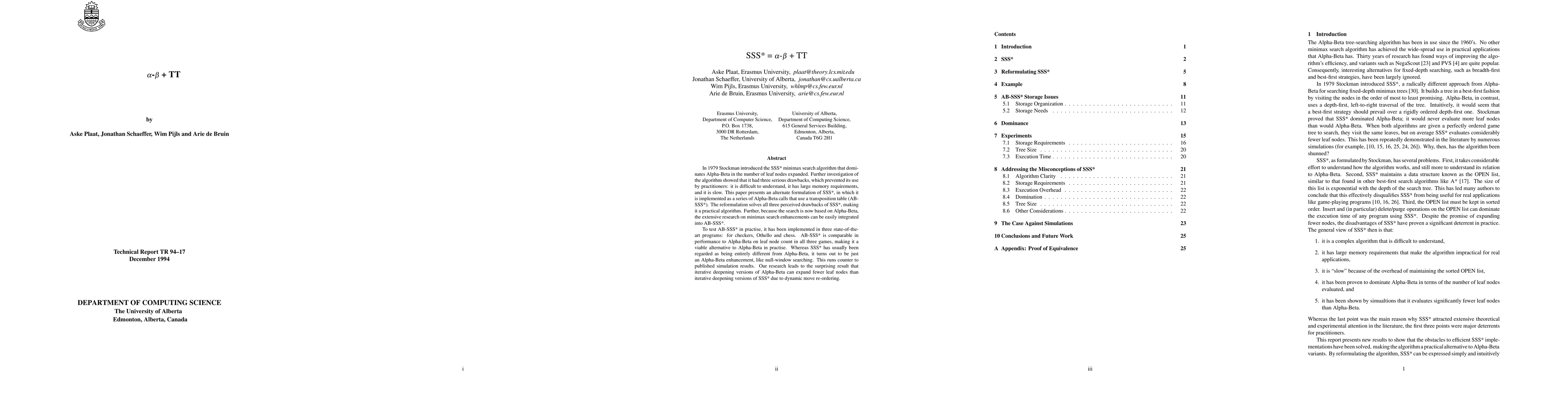 In 1979 Stockman introduced the SSS* minimax search algorithm that domi- nates Alpha-Beta in the number of leaf nodes expanded. Further investigation of the algorithm showed that it had three serious drawbacks, which prevented its use by practitioners: it is difficult to understand, it has large memory requirements, and it is slow. This paper presents an alternate formulation of SSS*, in which it is implemented as a series of Alpha-Beta calls that use a transposition table (AB- SSS*). The reformulation solves all three perceived drawbacks of SSS*, making it a practical algorithm. Further, because the search is now based on Alpha-Beta, the extensive research on minimax search enhancements can be easily integrated into AB-SSS*. To test AB-SSS* in practise, it has been implemented in three state-of-the- art programs: for checkers, Othello and chess. AB-SSS* is comparable in performance to Alpha-Beta on leaf node count in all three games, making it a viable alternative to Alpha-Beta in practise. Whereas SSS* has usually been regarded as being entirely different from Alpha-Beta, it turns out to be just an Alpha-Beta enhancement, like null-window searching. This runs counter to published simulation results. Our research leads to the surprising result that iterative deepening versions of Alpha-Beta can expand fewer leaf nodes than iterative deepening versions of SSS* due to dynamic move re-ordering.
