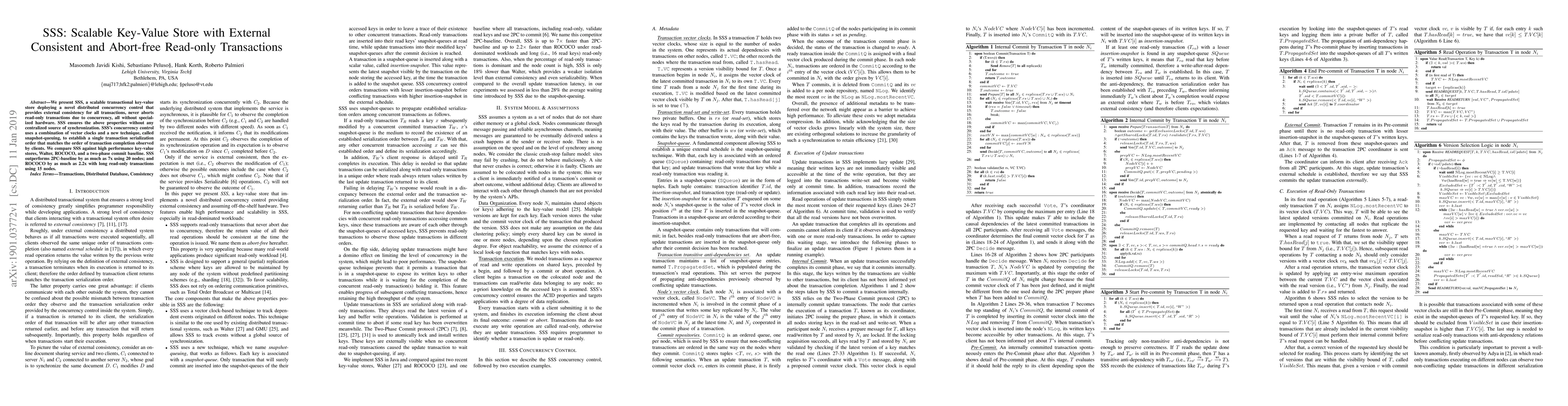 SSS is a scalable key-value store that employs a novel distributed concurrency control to provide external consistency and abort-free read-only transactions without centralized synchronization. It outperforms traditional two-phase commit and ROCOCO in performance tests.