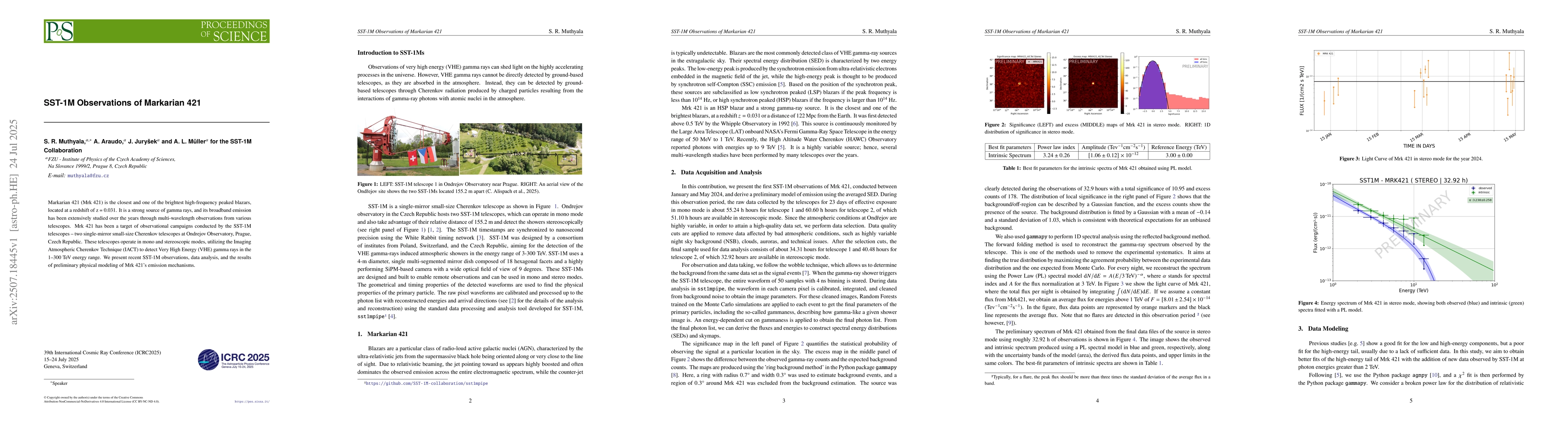 Markarian 421 (Mrk 421) is the closest and one of the brightest high-frequency peaked blazars, located at a redshift of z = 0.031. It is a strong source of gamma rays, and its broadband emission has been extensively studied over the years through multi-wavelength observations from various telescopes. Mrk 421 has been a target of observational campaigns conducted by the SST-1M telescopes - two single-mirror small-size Cherenkov telescopes at Ondrejov Observatory, Prague, Czech Republic. These telescopes operate in mono and stereoscopic modes, utilizing the Imaging Atmospheric Cherenkov Technique (IACT) to detect Very High Energy (VHE) gamma rays in the 1-300 TeV energy range. We present recent SST-1M observations, data analysis, and the results of preliminary physical modeling of Mrk 421's emission mechanisms.