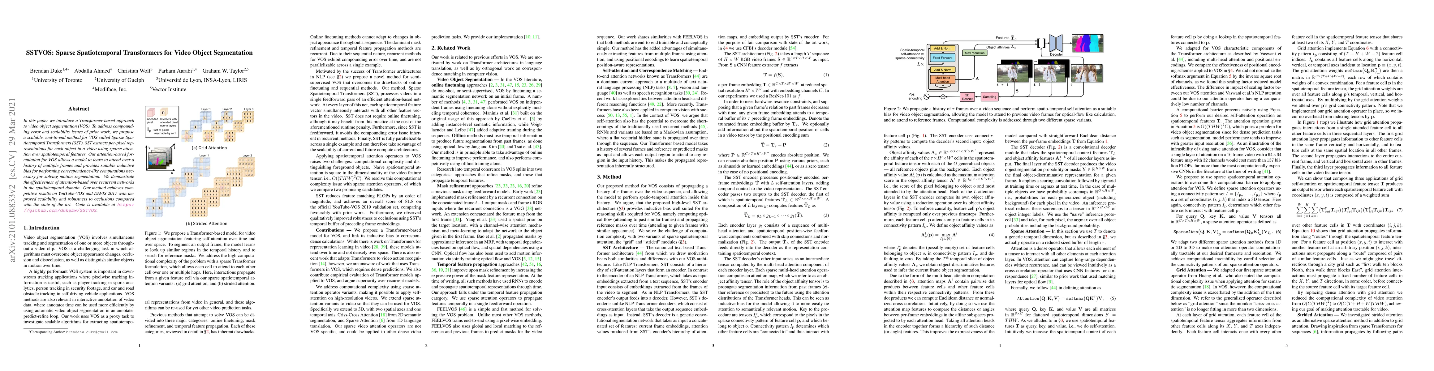 This paper introduces Sparse Spatiotemporal Transformers (SST) for video object segmentation, addressing error compounding and scalability issues. SST uses sparse attention over spatiotemporal features for per-pixel object representation, achieving competitive results on YouTube-VOS and DAVIS 2017 with improved scalability and robustness to occlusions.