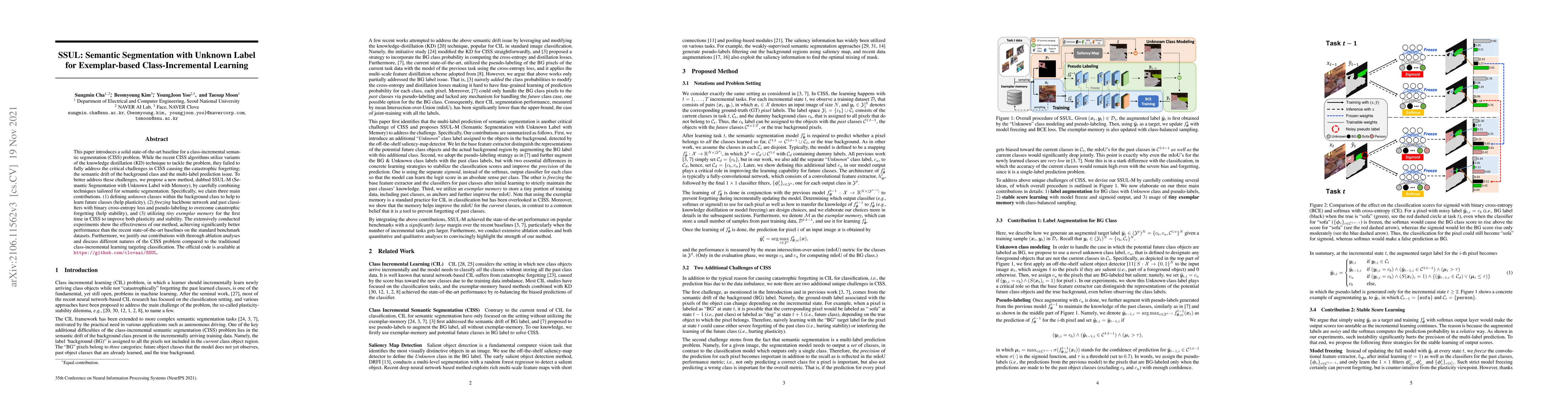 This paper proposes SSUL-M for class-incremental semantic segmentation, addressing challenges like catastrophic forgetting and semantic drift. It introduces unknown classes, freezes the backbone network, and uses tiny exemplar memory to enhance both plasticity and stability, achieving superior performance on benchmark datasets.