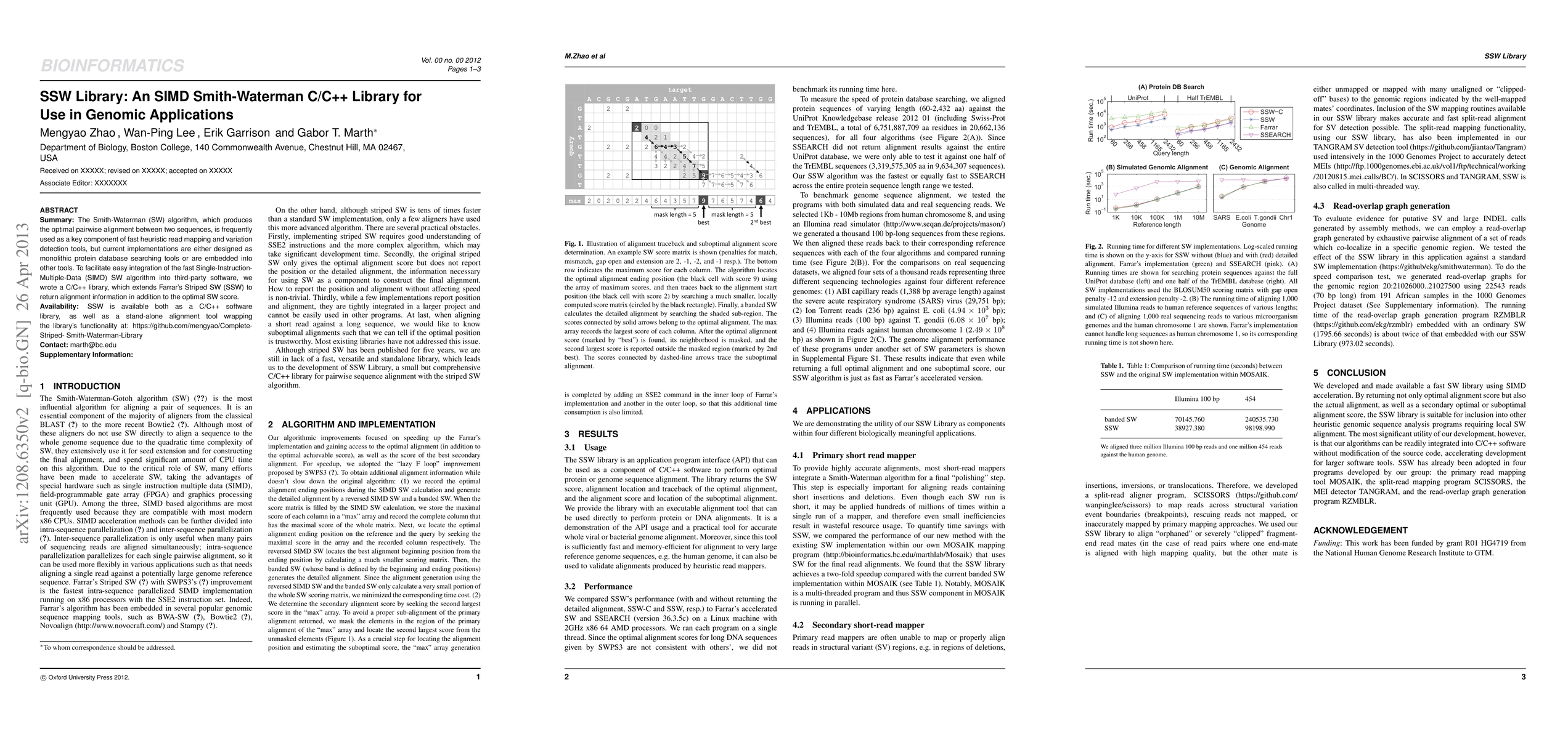 Summary: This paper introduces a C/C++ SIMD-enhanced Smith-Waterman library (SSW) for genomic applications, extending Farrar's Striped SW to provide alignment details alongside scores, aimed at integrating efficiently into third-party tools. The library is available for download from GitHub.