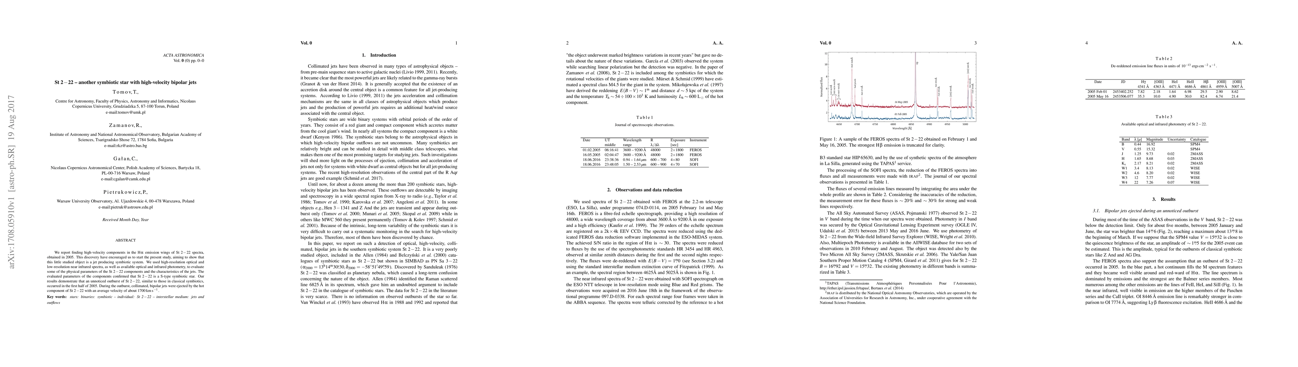 We report finding high-velocity components in the H{\alpha} emission wings of St 2-22 spectra, obtained in 2005. This discovery have encouraged us to start the present study, aiming to show that this little studied object is a jet producing symbiotic system. We used high-resolution optical and low-resolution near infrared spectra, as well as available optical and infrared photometry, to evaluate some of the physical parameters of the St 2-22 components and the characteristics of the jets. The evaluated parameters of the components confirmed that St 2-22 is a S-type symbiotic star. Our results demonstrate that an unnoticed outburst of St 2-22, similar to those in classical symbiotics, occurred in the first half of 2005. During the outburst, collimated, bipolar jets were ejected by the hot component of St 2-22 with an average velocity of about 1700 km/s.