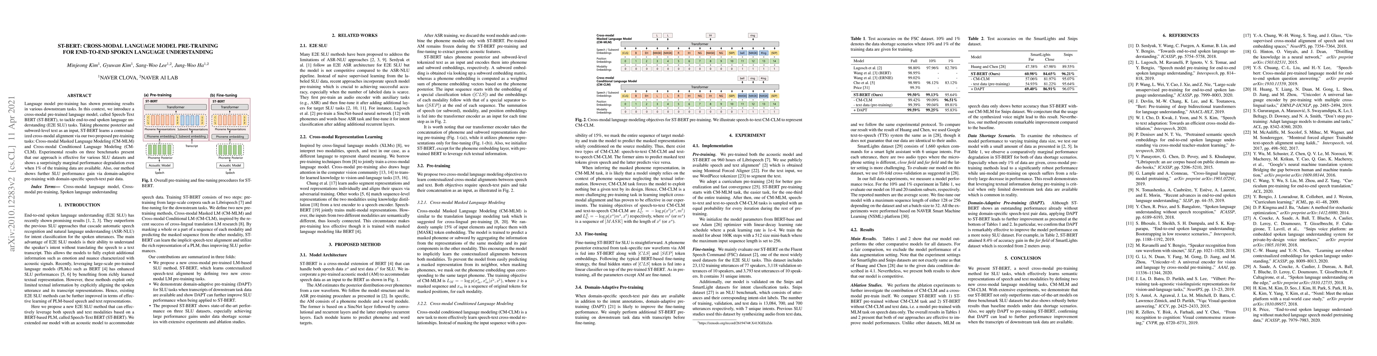 ST-BERT is a cross-modal pre-trained language model designed for end-to-end spoken language understanding, utilizing phoneme posterior and subword-level text inputs. It achieves contextualized cross-modal alignment through two pre-training tasks, showing effective performance across various SLU datasets even with limited training data.
