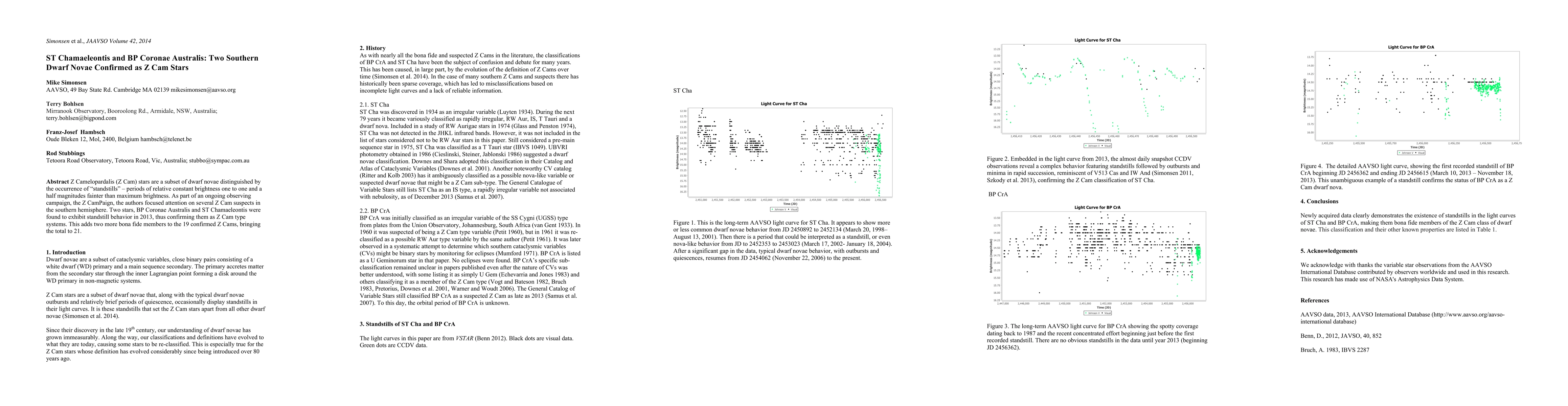 Two southern dwarf novae, BP Coronae Australis and ST Chamaeleontis, have been confirmed as Z Cam type stars after exhibiting standstill behavior in 2013, adding to the total of 21 confirmed members of this subset of dwarf novae.