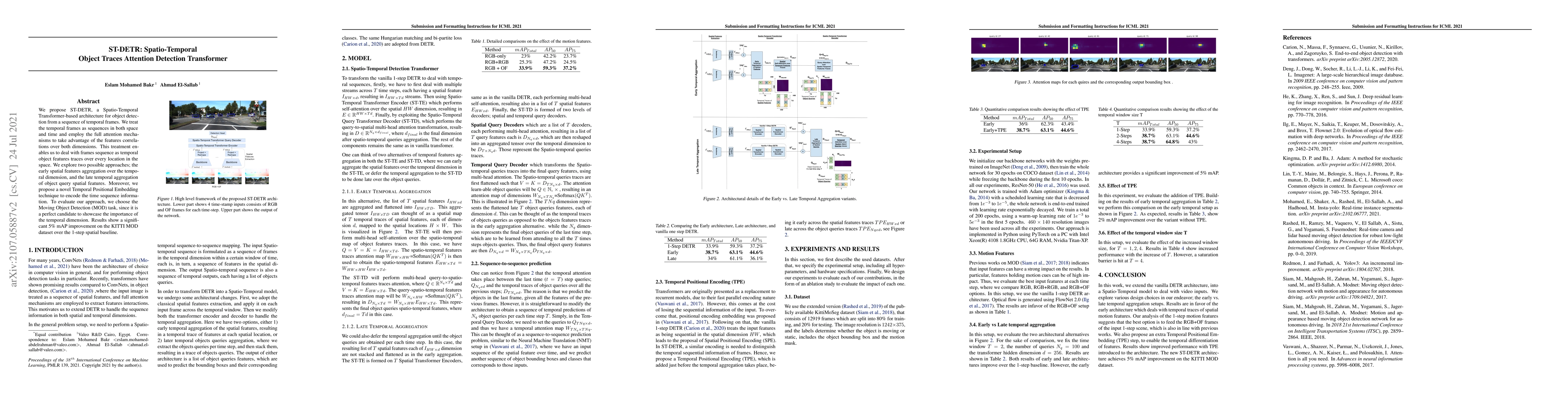 We propose ST-DETR, a Spatio-Temporal Transformer-based architecture for object detection from a sequence of temporal frames. We treat the temporal frames as sequences in both space and time and employ the full attention mechanisms to take advantage of the features correlations over both dimensions. This treatment enables us to deal with frames sequence as temporal object features traces over every location in the space. We explore two possible approaches; the early spatial features aggregation over the temporal dimension, and the late temporal aggregation of object query spatial features. Moreover, we propose a novel Temporal Positional Embedding technique to encode the time sequence information. To evaluate our approach, we choose the Moving Object Detection (MOD)task, since it is a perfect candidate to showcase the importance of the temporal dimension. Results show a significant 5% mAP improvement on the KITTI MOD dataset over the 1-step spatial baseline.