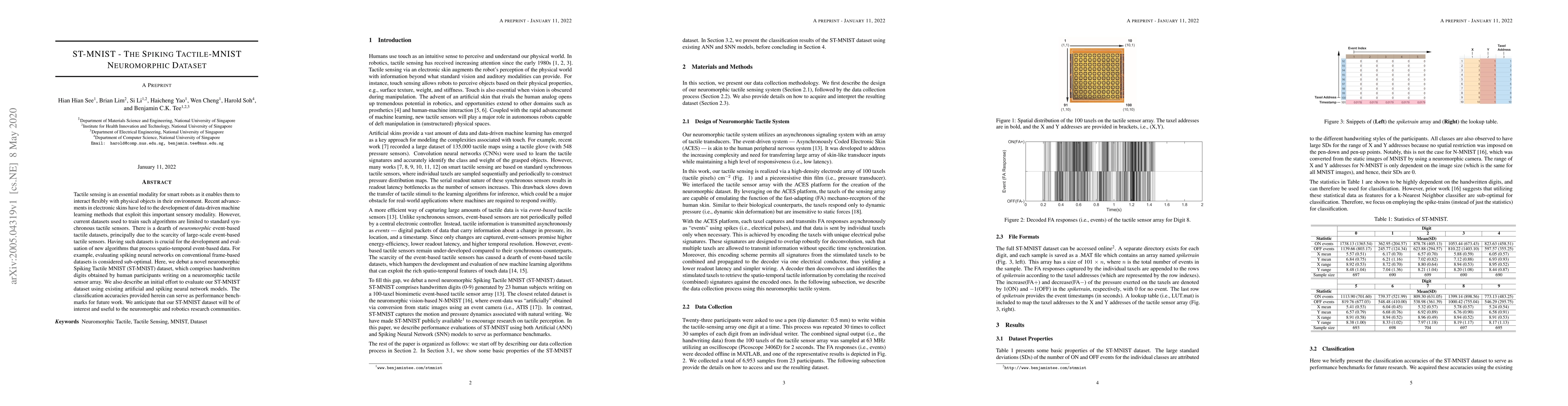 The ST-MNIST dataset presents a novel neuromorphic tactile dataset of handwritten digits captured by a neuromorphic sensor array, aiming to enhance the development of event-based tactile sensing algorithms. Initial evaluations using artificial and spiking neural networks provide benchmarks for future research in neuromorphic and robotics fields.