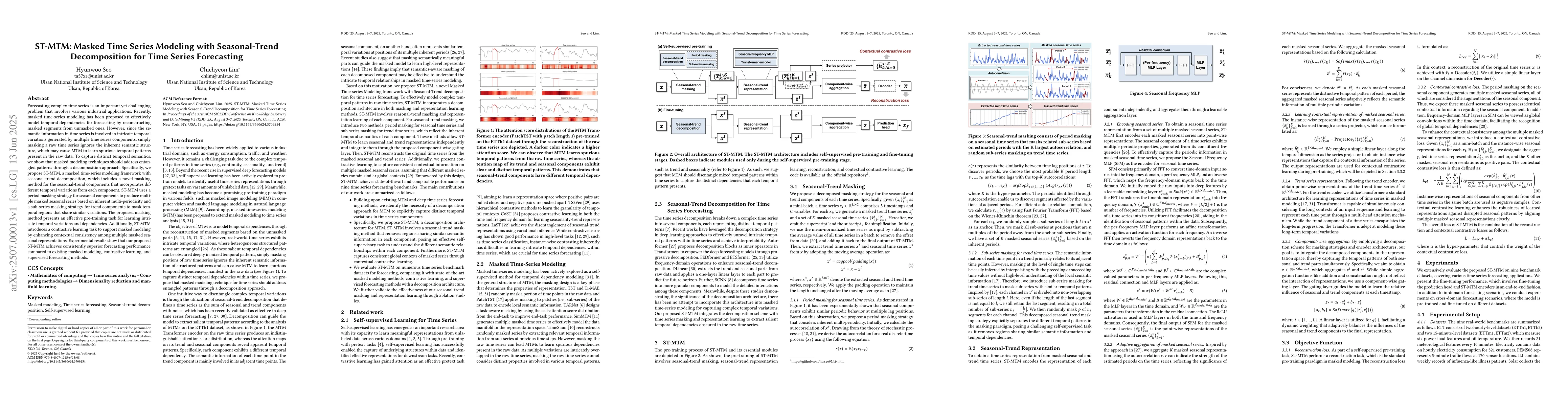 Forecasting complex time series is an important yet challenging problem that involves various industrial applications. Recently, masked time-series modeling has been proposed to effectively model temporal dependencies for forecasting by reconstructing masked segments from unmasked ones. However, since the semantic information in time series is involved in intricate temporal variations generated by multiple time series components, simply masking a raw time series ignores the inherent semantic structure, which may cause MTM to learn spurious temporal patterns present in the raw data. To capture distinct temporal semantics, we show that masked modeling techniques should address entangled patterns through a decomposition approach. Specifically, we propose ST-MTM, a masked time-series modeling framework with seasonal-trend decomposition, which includes a novel masking method for the seasonal-trend components that incorporates different temporal variations from each component. ST-MTM uses a period masking strategy for seasonal components to produce multiple masked seasonal series based on inherent multi-periodicity and a sub-series masking strategy for trend components to mask temporal regions that share similar variations. The proposed masking method presents an effective pre-training task for learning intricate temporal variations and dependencies. Additionally, ST-MTM introduces a contrastive learning task to support masked modeling by enhancing contextual consistency among multiple masked seasonal representations. Experimental results show that our proposed ST-MTM achieves consistently superior forecasting performance compared to existing masked modeling, contrastive learning, and supervised forecasting methods.