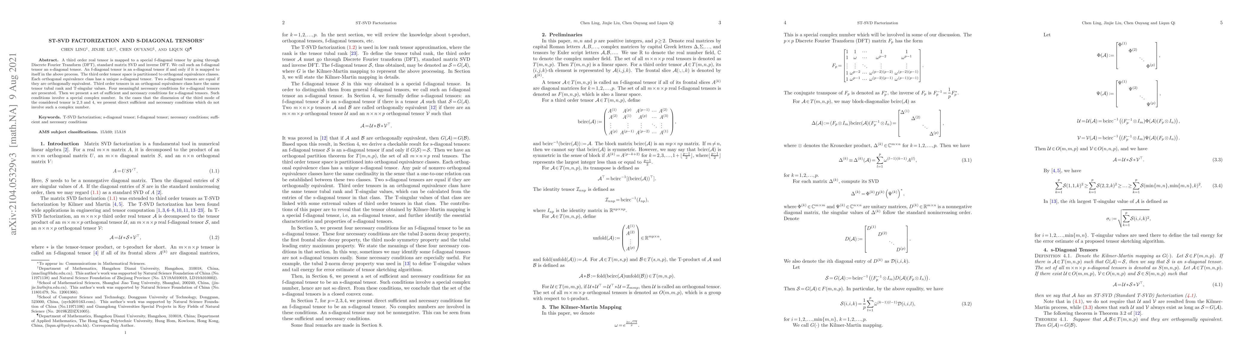 This paper introduces the concept of s-diagonal tensors derived from third-order tensors via Discrete Fourier Transform, SVD, and inverse DFT. It establishes necessary and sufficient conditions for tensors to be s-diagonal, partitions the tensor space into orthogonal equivalence classes, and provides specific conditions for tensors with dimensions 2, 3, and 4.