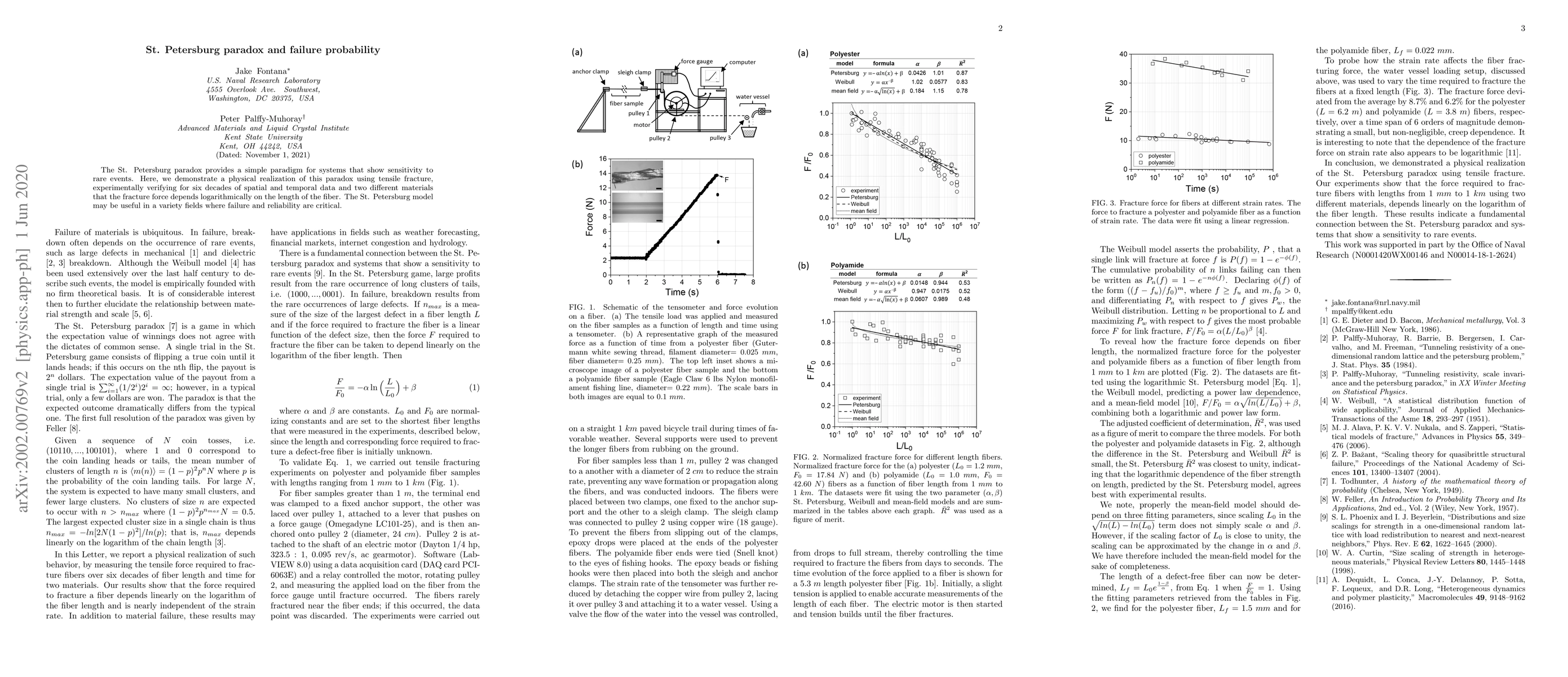 The St. Petersburg paradox is experimentally realized through tensile fracture, showing a logarithmic dependence of fracture force on fiber length. This model highlights the importance of rare events in failure probability and reliability across various fields.