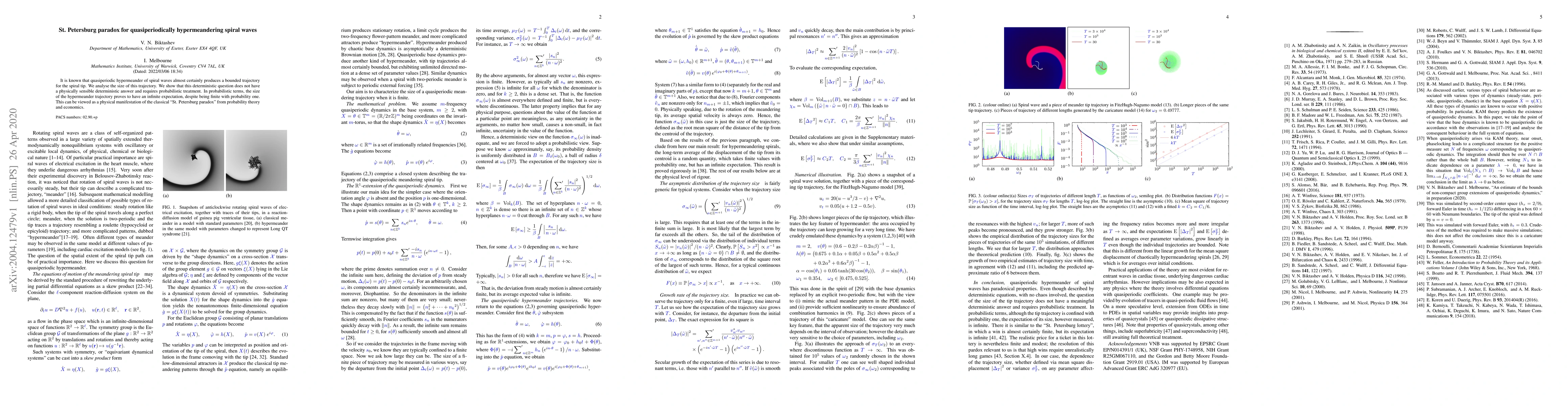 It is known that quasiperiodic hypermeander of spiral waves almost certainly produces a bounded trajectory for the spiral tip. We analyse the size of this trajectory. We show that this deterministic question does not have a physically sensible deterministic answer and requires probabilistic treatment. In probabilistic terms, the size of the hypermeander trajectory proves to have an infinite expectation, despite being finite with probability one. This can be viewed as a physical manifestation of the classical "St. Petersburg paradox" from probability theory and economics.