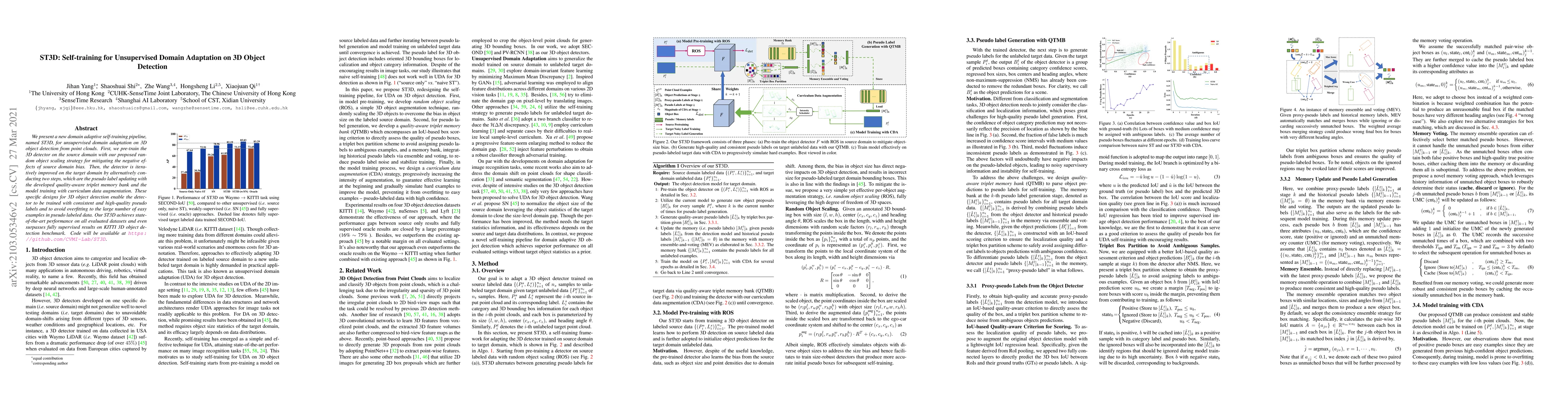 The paper introduces ST3D, a self-training framework for unsupervised domain adaptation in 3D object detection from point clouds, achieving state-of-the-art results by leveraging random object scaling and a quality-aware triplet memory bank for pseudo label updating. The method outperforms fully supervised models on the KITTI benchmark.