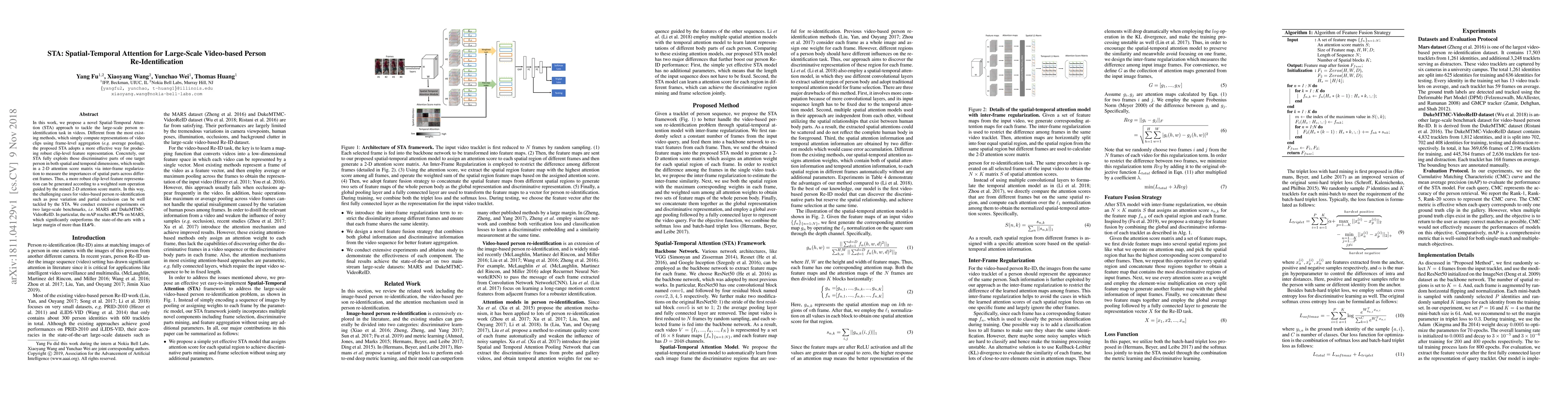 The paper introduces a Spatial-Temporal Attention (STA) approach for large-scale video-based person re-identification, which generates robust clip-level feature representations by exploiting discriminative parts and inter-frame regularization, achieving superior performance on benchmarks like MARS and DukeMTMC-VideoReID. The proposed method notably outperforms existing methods, with an mAP of 87.7% on MARS.