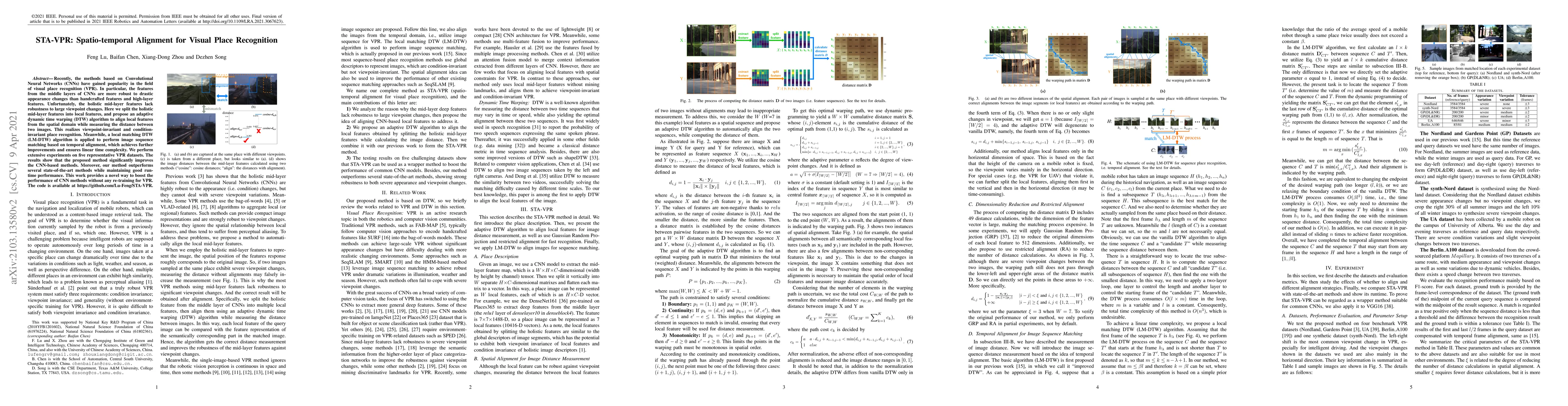 This paper introduces STA-VPR, a method that enhances visual place recognition (VPR) using Convolutional Neural Networks (CNNs). It splits mid-layer CNN features into local features and employs adaptive dynamic time warping (DTW) for spatial alignment and local matching DTW (LM-DTW) for temporal alignment, achieving improved robustness to viewpoint and environmental changes. The proposed approach outperforms existing state-of-the-art methods on multiple VPR datasets while maintaining efficient run-time performance.