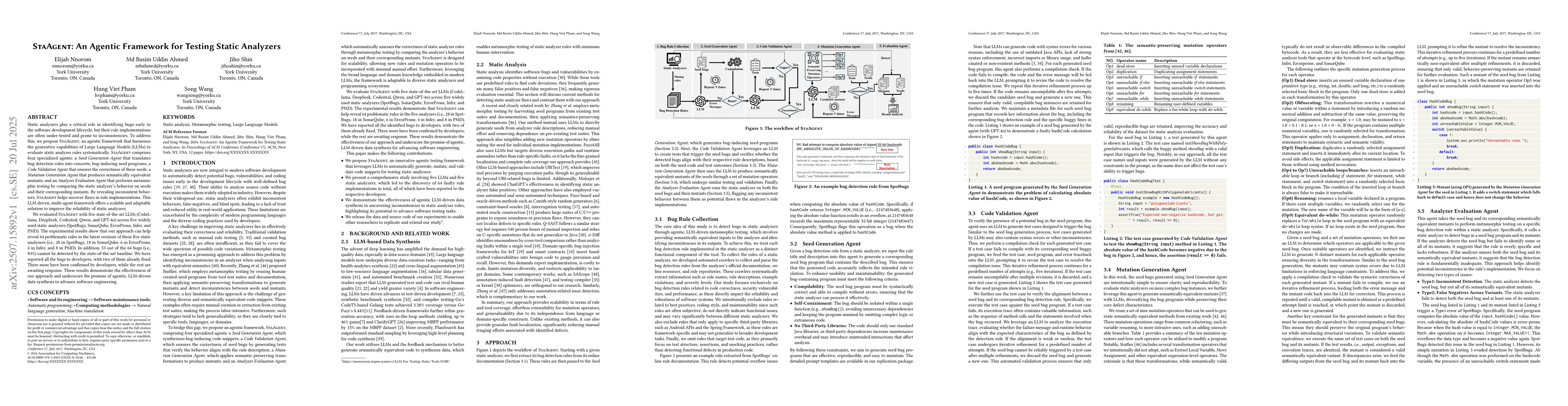 Static analyzers play a critical role in identifying bugs early in the software development lifecycle, but their rule implementations are often under-tested and prone to inconsistencies. To address this, we propose StaAgent, an agentic framework that harnesses the generative capabilities of Large Language Models (LLMs) to systematically evaluate static analyzer rules. StaAgent comprises four specialized agents: a Seed Generation Agent that translates bug detection rules into concrete, bug-inducing seed programs; a Code Validation Agent that ensures the correctness of these seeds; a Mutation Generation Agent that produces semantically equivalent mutants; and an Analyzer Evaluation Agent that performs metamorphic testing by comparing the static analyzer's behavior on seeds and their corresponding mutants. By revealing inconsistent behaviors, StaAgent helps uncover flaws in rule implementations. This LLM-driven, multi-agent framework offers a scalable and adaptable solution to improve the reliability of static analyzers. We evaluated StaAgent with five state-of-the-art LLMs (CodeL-lama, DeepSeek, Codestral, Qwen, and GPT-4o) across five widely used static analyzers (SpotBugs, SonarQube, ErrorProne, Infer, and PMD). The experimental results show that our approach can help reveal 64 problematic rules in the latest versions of these five static analyzers (i.e., 28 in SpotBugs, 18 in SonarQube, 6 in ErrorProne, 4 in Infer, and 8 in PMD). In addition, 53 out of the 64 bugs cannot be detected by the SOTA baseline. We have reported all the bugs to developers, with two of them already fixed. Three more have been confirmed by developers, while the rest are awaiting response. These results demonstrate the effectiveness of our approach and underscore the promise of agentic, LLM-driven data synthesis to advance software engineering.