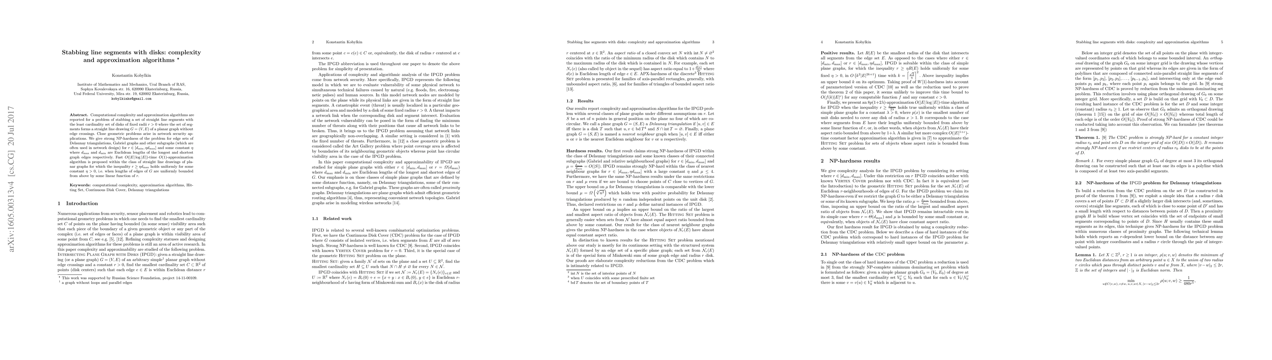 Computational complexity and approximation algorithms are reported for a problem of stabbing a set of straight line segments with the least cardinality set of disks of fixed radii $r>0$ where the set of segments forms a straight line drawing $G=(V,E)$ of a planar graph without edge crossings. Close geometric problems arise in network security applications. We give strong NP-hardness of the problem for edge sets of Delaunay triangulations, Gabriel graphs and other subgraphs (which are often used in network design) for $r\in [d_{\min},\eta d_{\max}]$ and some constant $\eta$ where $d_{\max}$ and $d_{\min}$ are Euclidean lengths of the longest and shortest graph edges respectively. Fast $O(|E|\log|E|)$-time $O(1)$-approximation algorithm is proposed within the class of straight line drawings of planar graphs for which the inequality $r\geq \eta d_{\max}$ holds uniformly for some constant $\eta>0,$ i.e. when lengths of edges of $G$ are uniformly bounded from above by some linear function of $r.$