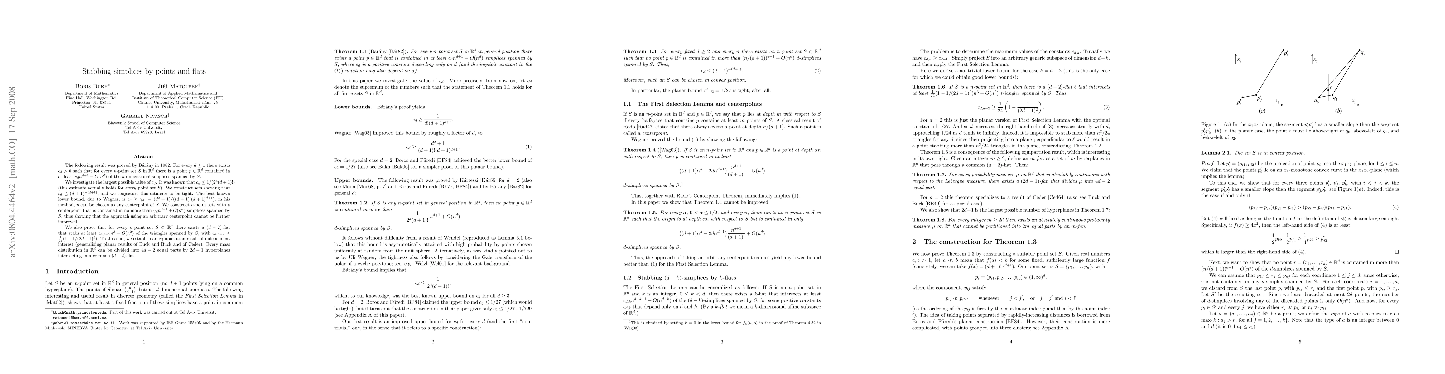 The following result was proved by Barany in 1982: For every d >= 1 there exists c_d > 0 such that for every n-point set S in R^d there is a point p in R^d contained in at least c_d n^{d+1} - O(n^d) of the simplices spanned by S. We investigate the largest possible value of c_d. It was known that c_d <= 1/(2^d(d+1)!) (this estimate actually holds for every point set S). We construct sets showing that c_d <= (d+1)^{-(d+1)}, and we conjecture this estimate to be tight. The best known lower bound, due to Wagner, is c_d >= gamma_d := (d^2+1)/((d+1)!(d+1)^{d+1}); in his method, p can be chosen as any centerpoint of S. We construct n-point sets with a centerpoint that is contained in no more than gamma_d n^{d+1}+O(n^d) simplices spanned by S, thus showing that the approach using an arbitrary centerpoint cannot be further improved. We also prove that for every n-point set S in R^d there exists a (d-2)-flat that stabs at least c_{d,d-2} n^3 - O(n^2) of the triangles spanned by S, with c_{d,d-2}>=(1/24)(1- 1/(2d-1)^2). To this end, we establish an equipartition result of independent interest (generalizing planar results of Buck and Buck and of Ceder): Every mass distribution in R^d can be divided into 4d-2 equal parts by 2d-1 hyperplanes intersecting in a common (d-2)-flat.