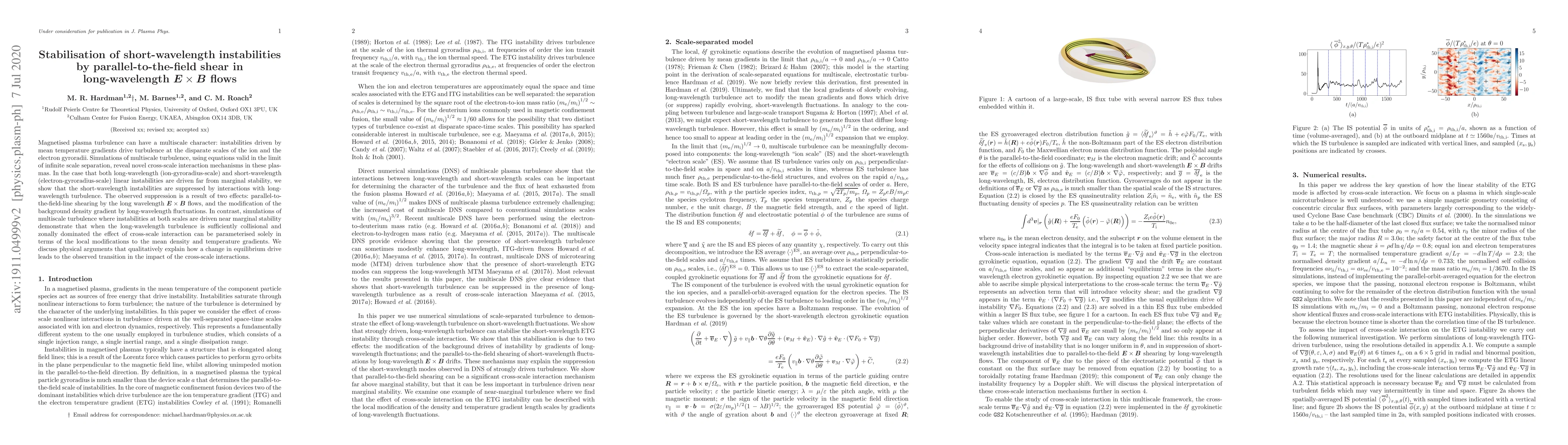 This paper investigates how long-wavelength $\mathbf{E} \times \mathbf{B}$ flows stabilise short-wavelength instabilities in magnetised plasma turbulence through parallel-to-the-field shear and density gradient modifications. It finds that the suppression of short-wavelength instabilities is more pronounced when driven far from marginal stability, contrasting with scenarios where interactions are dominated by the local mean gradients.