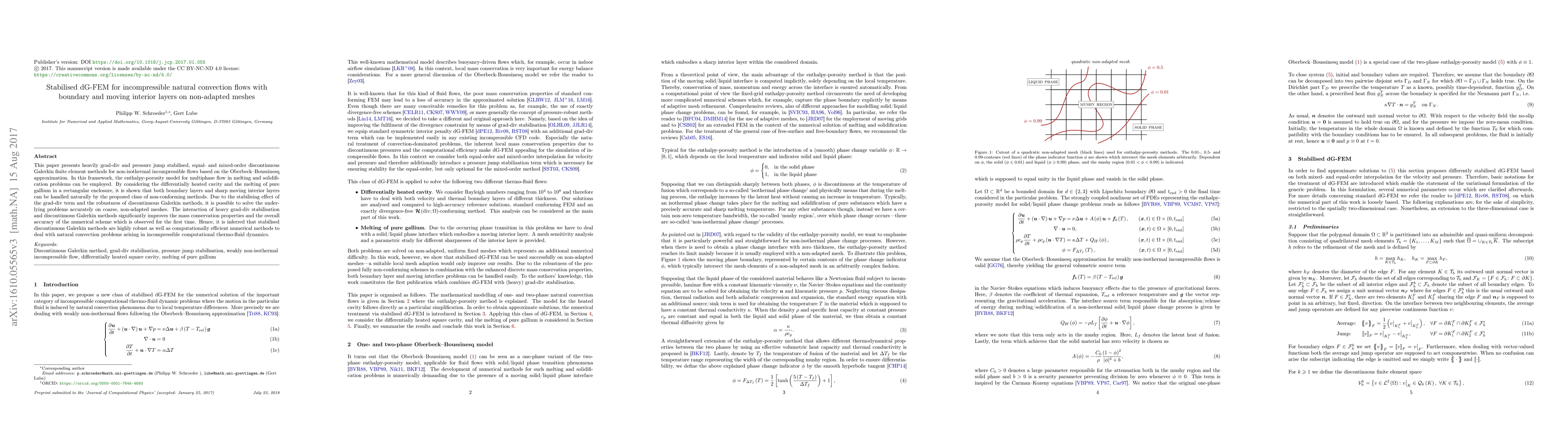 This paper presents heavily grad-div and pressure jump stabilised, equal- and mixed-order discontinuous Galerkin finite element methods for non-isothermal incompressible flows based on the Oberbeck-Boussinesq approximation. In this framework, the enthalpy-porosity model for multiphase flow in melting and solidification problems can be employed. By considering the differentially heated cavity and the melting of pure gallium in a rectangular enclosure, it is shown that both boundary layers and sharp moving interior layers can be handled naturally by the proposed class of non-conforming methods. Due to the stabilising effect of the grad-div term and the robustness of discontinuous Galerkin methods, it is possible to solve the underlying problems accurately on coarse, non-adapted meshes. The interaction of heavy grad-div stabilisation and discontinuous Galerkin methods significantly improves the mass conservation properties and the overall accuracy of the numerical scheme which is observed for the first time. Hence, it is inferred that stabilised discontinuous Galerkin methods are highly robust as well as computationally efficient numerical methods to deal with natural convection problems arising in incompressible computational thermo-fluid dynamics.