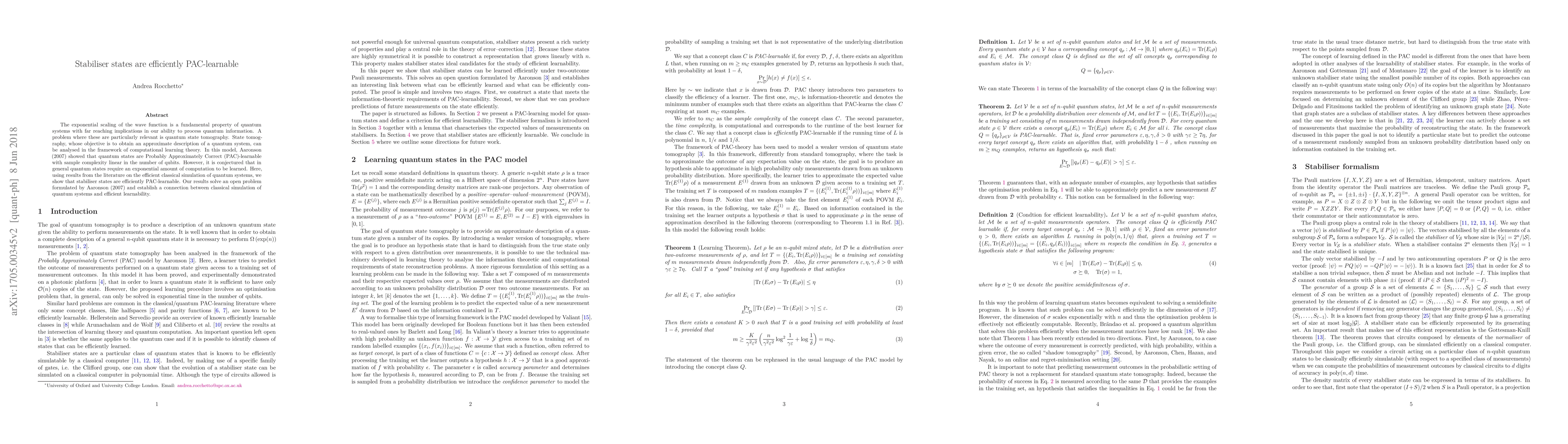 This paper demonstrates that stabiliser states, a class of quantum states, can be efficiently PAC-learnable, resolving an open problem posed by Aaronson. It leverages classical simulation techniques to show that these states require only linear sample complexity, challenging the notion that quantum state learning generally demands exponential computational resources.