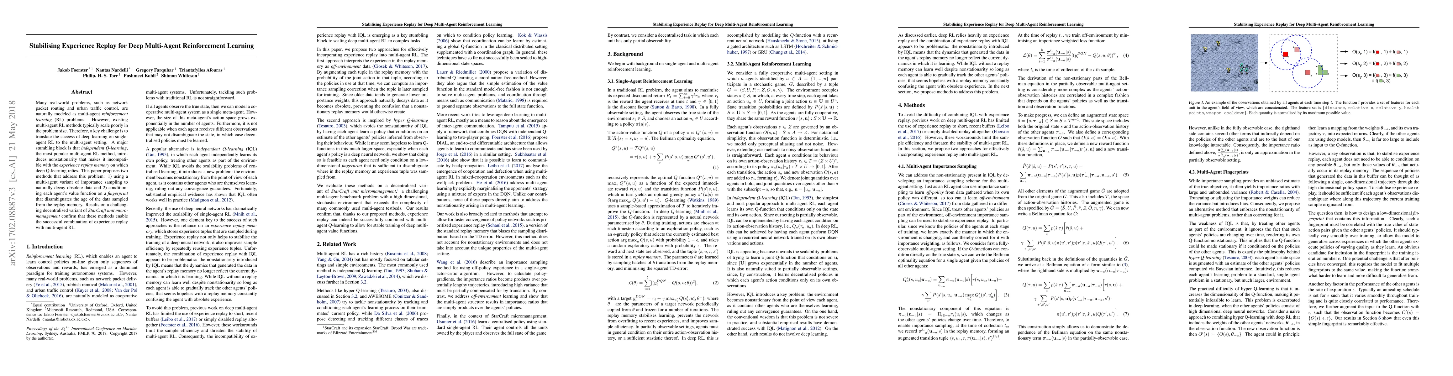 This paper proposes two methods to stabilise experience replay in deep multi-agent reinforcement learning: a multi-agent variant of importance sampling and conditioning value functions on data age fingerprints. These techniques enable effective experience replay in decentralised multi-agent RL, demonstrated by successful application in StarCraft unit micromanagement.